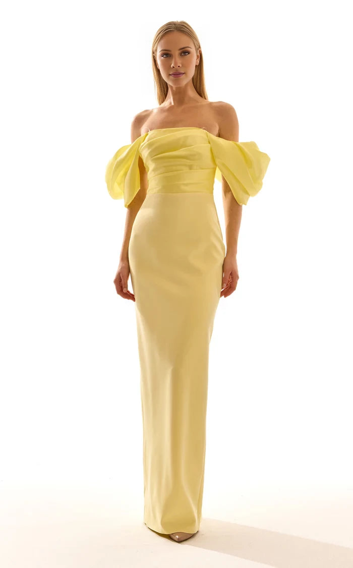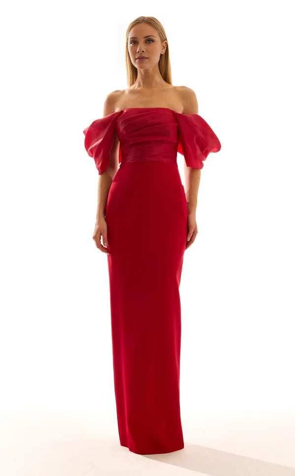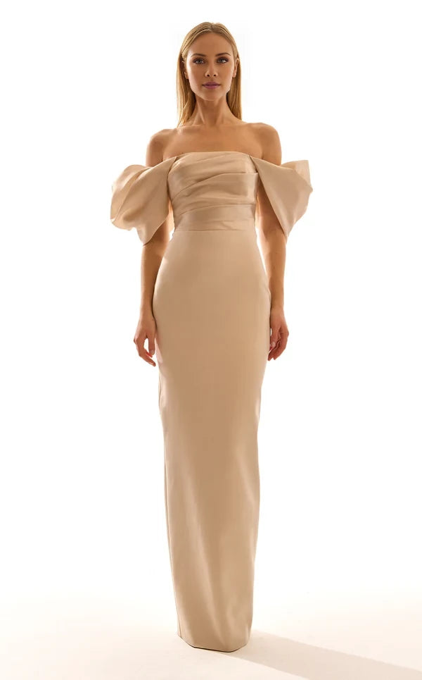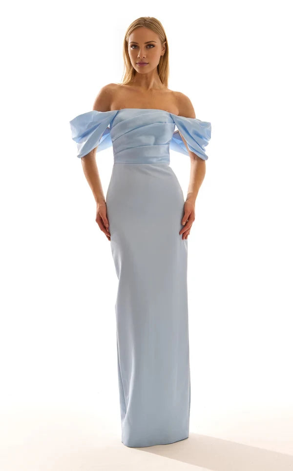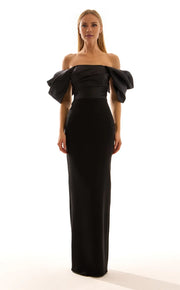 This elegant satin evening gown features an off-the-shoulder design and extends gracefully to the floor, combining classic sophistication with modern style.
