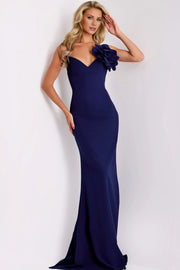This elegant one-shoulder gown features intricate 3D floral embellishments, making it a stunning choice for evening occasions.