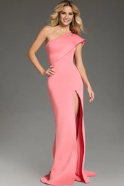 This elegant one-shoulder gown features a flowing cascading ruffle and a daring high slit, perfect for making a sophisticated statement at any evening event.