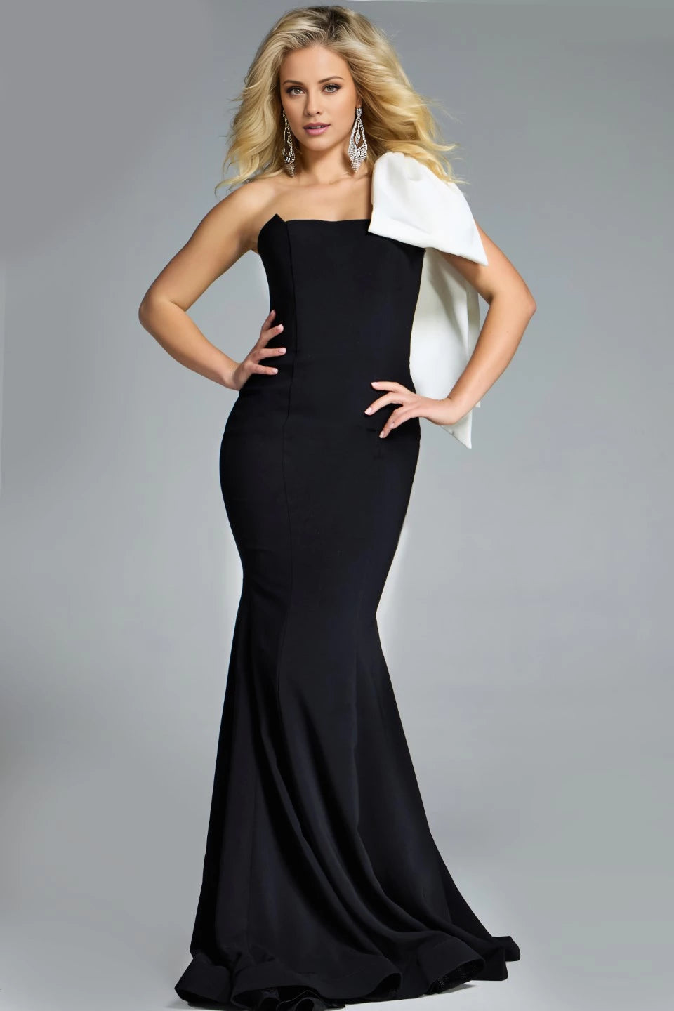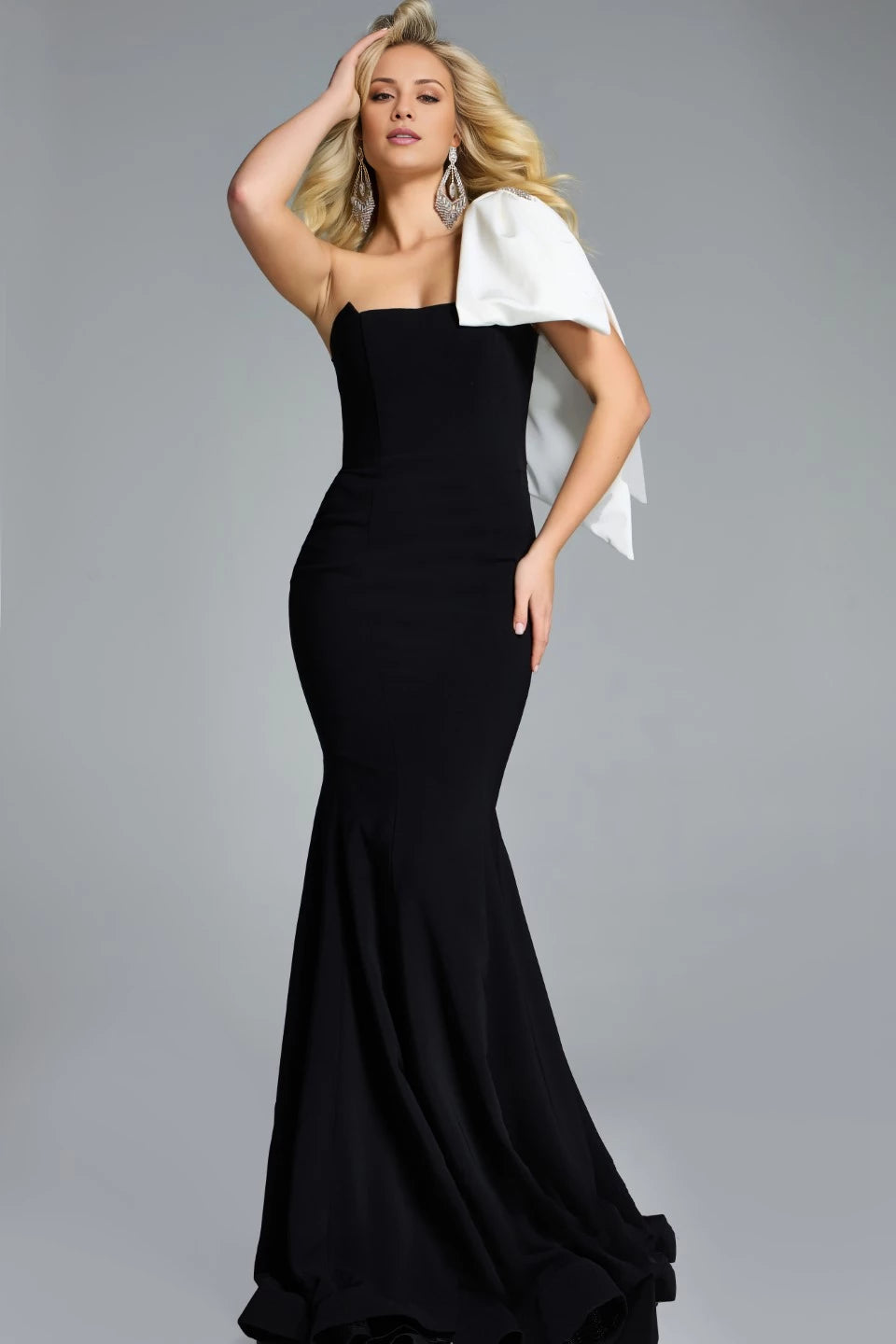 This elegant evening dress features a one-shoulder mermaid silhouette, accentuated by a striking satin bow for a sophisticated and dramatic effect.