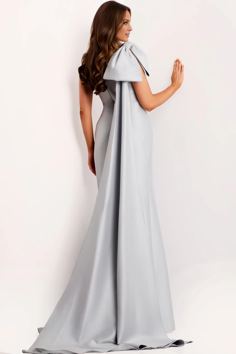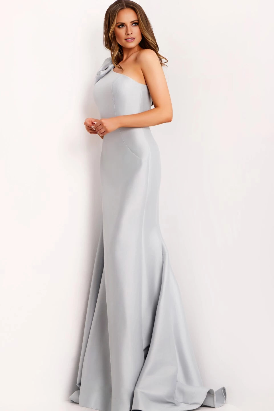 This elegant evening dress features a one-shoulder mermaid silhouette, accentuated by a dramatic oversized bow for a sophisticated and striking look.
