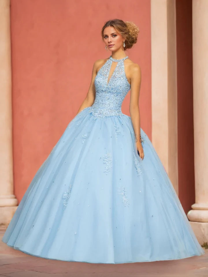 Romantic Ball Gown Halter Sleeveless Lace - Up Back Long Length Evening Dresses