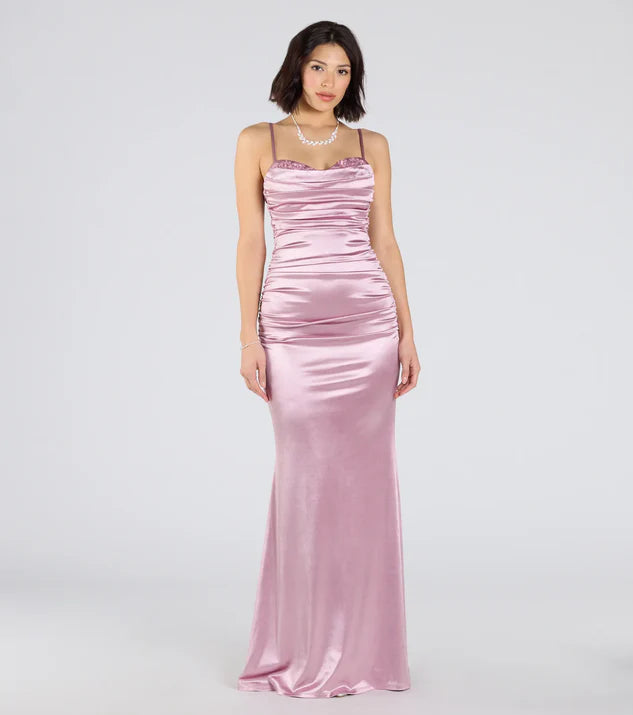 This evening gown features a mermaid silhouette crafted from satin, highlighted by a sweetheart neckline and intricate applique detailing for an elegant and refined look.