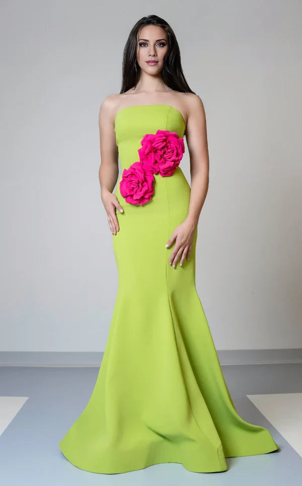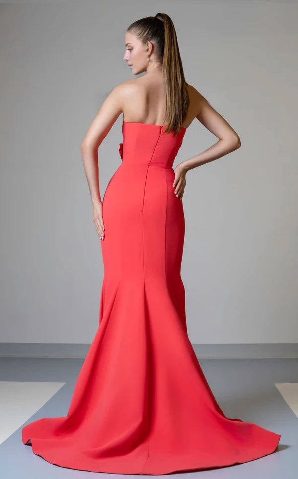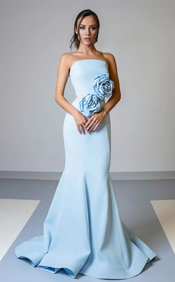 This elegant evening gown features a sleeveless, strapless design with a floor-length trumpet silhouette, perfect for formal occasions.