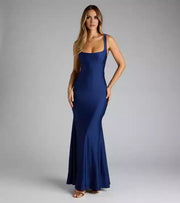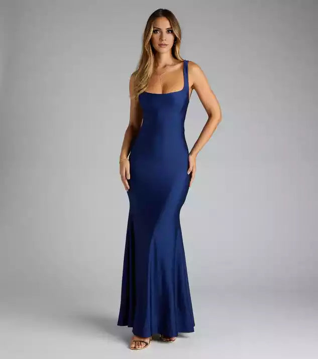 This elegant mermaid evening dress showcases a square neckline and a lace-up back with suspender straps, offering a sophisticated and form-fitting design.