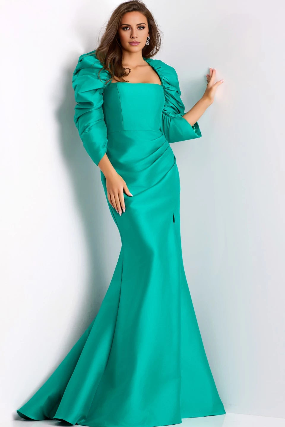 This evening dress features a floor-length design with a square neckline and elegant puff sleeves, creating a timeless and sophisticated silhouette.
