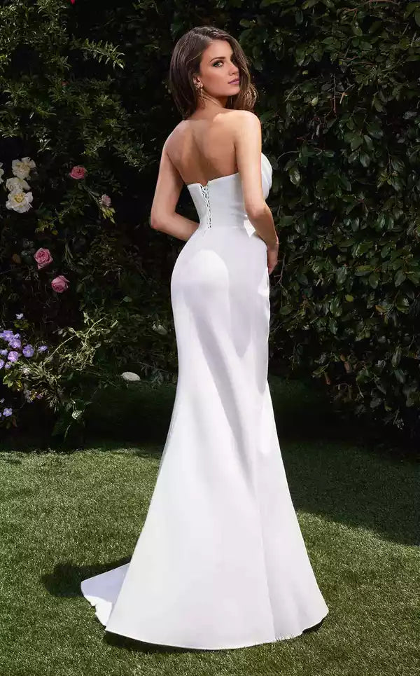 This floor-length evening gown features a strapless design with a split back and a tie neckline, combining elegance with a sophisticated silhouette.