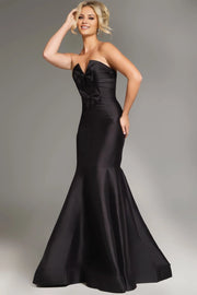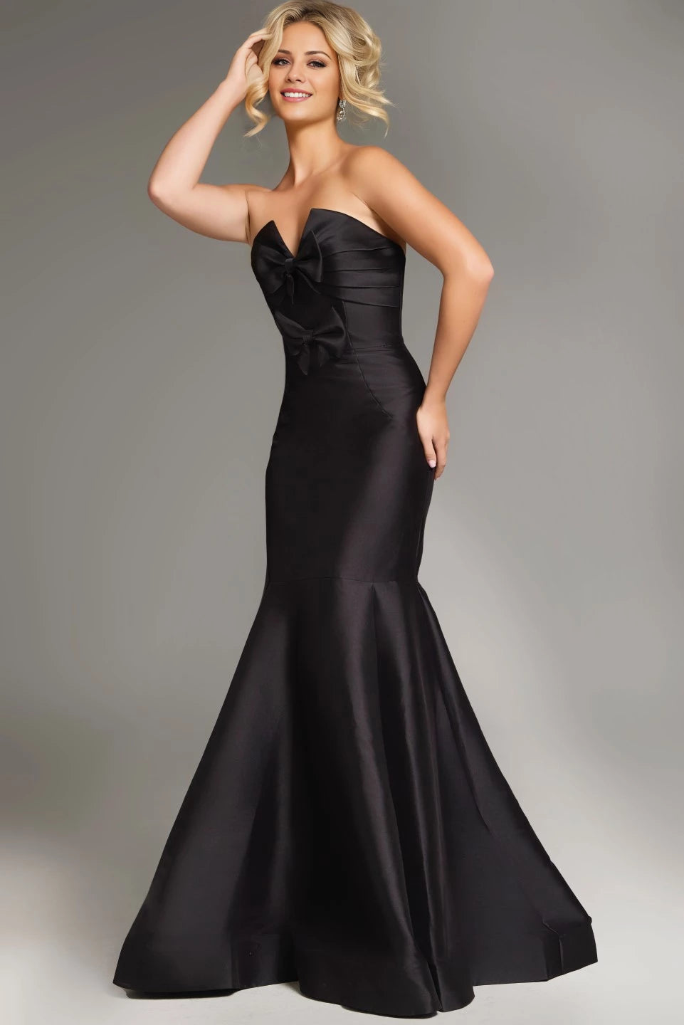 This elegant evening dress features a strapless satin mermaid silhouette, enhanced by a sophisticated bow detail for a refined and graceful look.