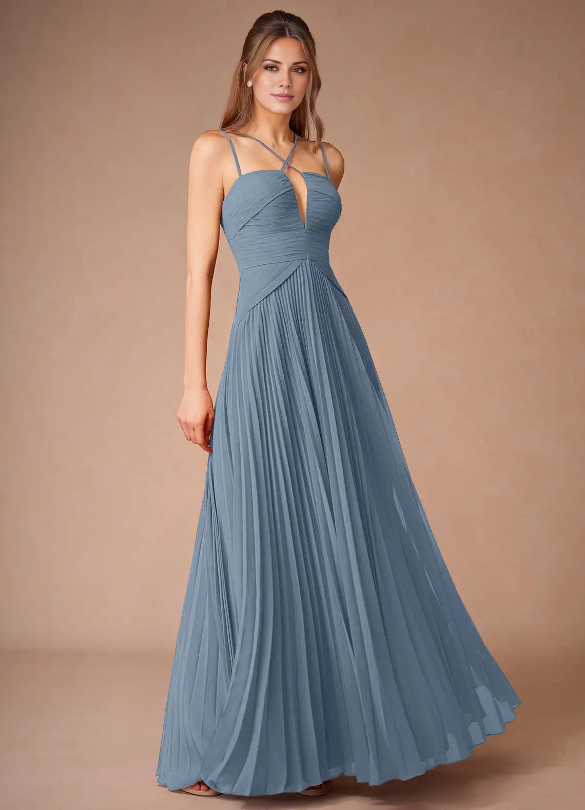 This elegant evening dress features delicate thin shoulder straps and a flowing long midi length, perfect for sophisticated occasions.