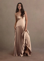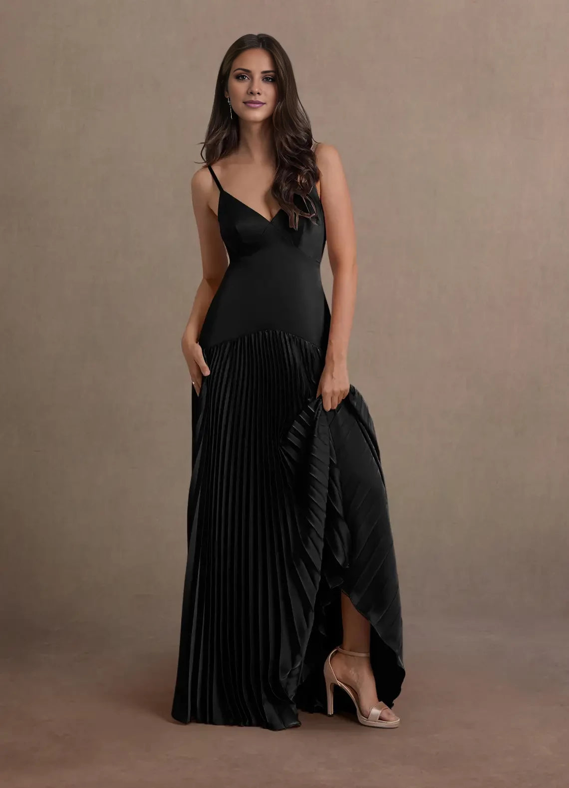 Evening gowns featuring a dropped waist design and a sophisticated V-neckline