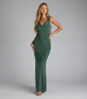 This evening maxi dress features a V-neckline and a subtly low back, combining elegance with a modern silhouette for a refined look.