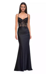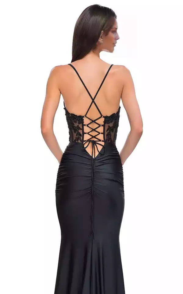 This elegant floor-length evening dress showcases a V-neckline, a lace-up back, and detailed applique that gracefully contours the hips.