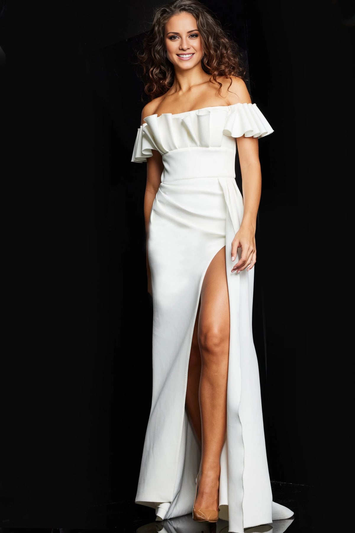 This elegant white evening gown features an off-the-shoulder design and a long silhouette with a stylish split fork, perfect for formal occasions.