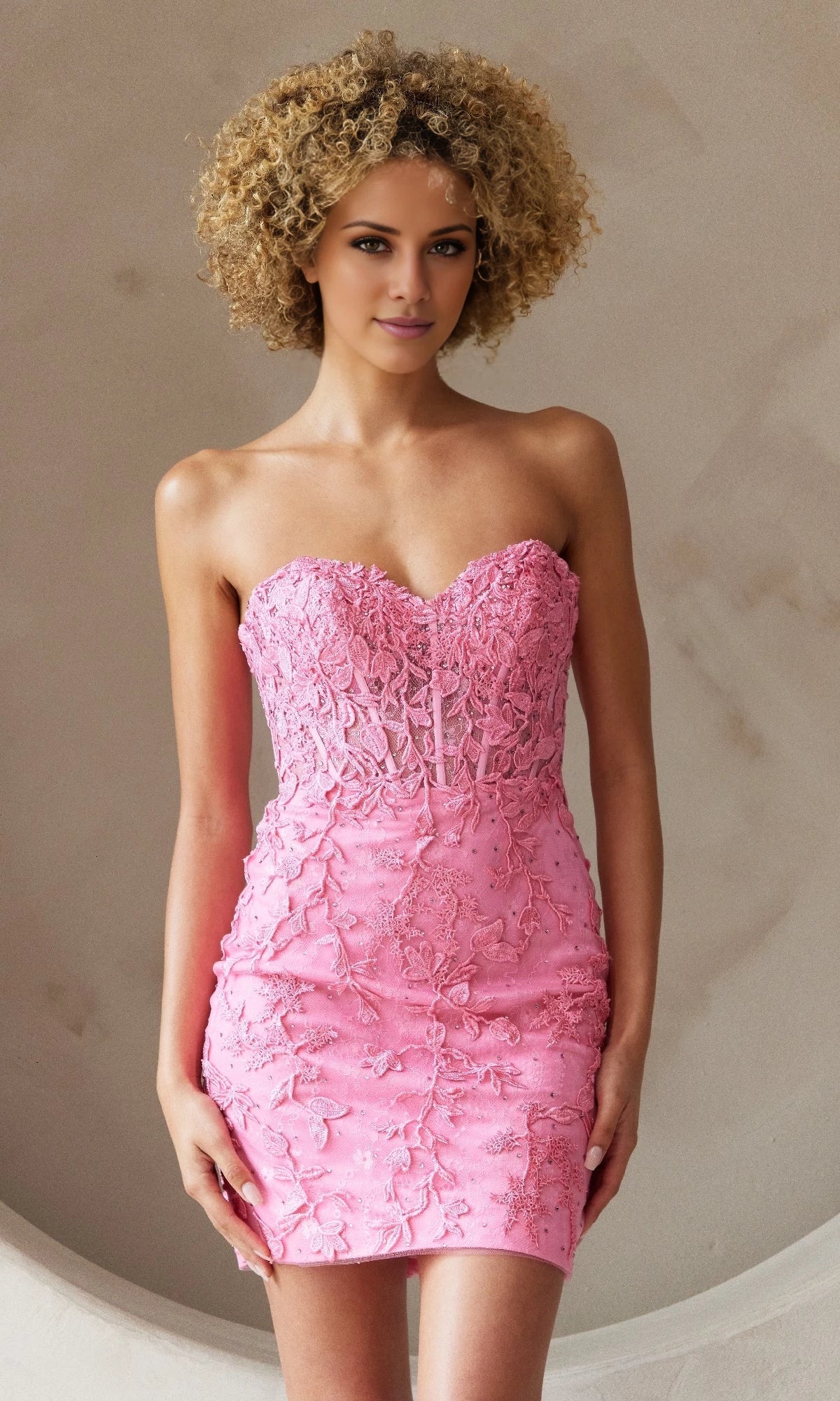 Intricately embroidered lace strapless short dress, designed specifically for homecoming events.