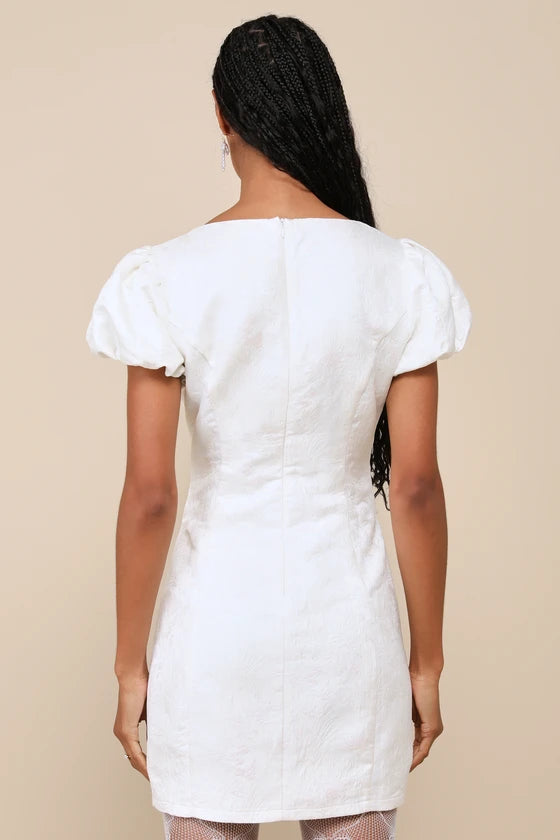 This standout mini dress features a floral jacquard design with puff sleeves, making it an ideal choice for homecoming events. Its exceptional craftsmanship and elegant silhouette ensure a memorable and sophisticated look.