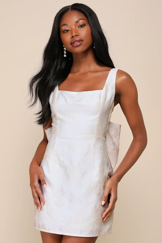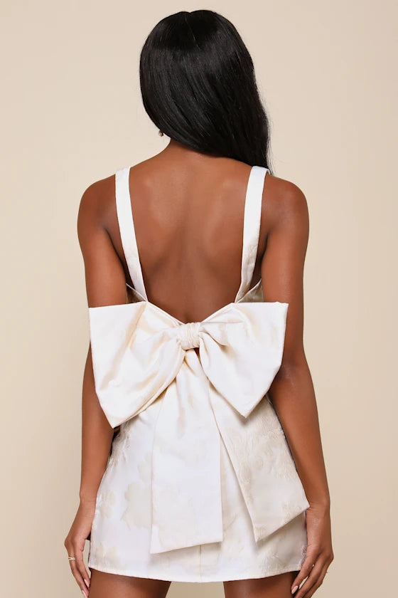 Elevate your homecoming look with the Flirtatious Poise Jacquard Mini Dress, featuring an elegant bow detail at the back for a sophisticated yet playful finish.