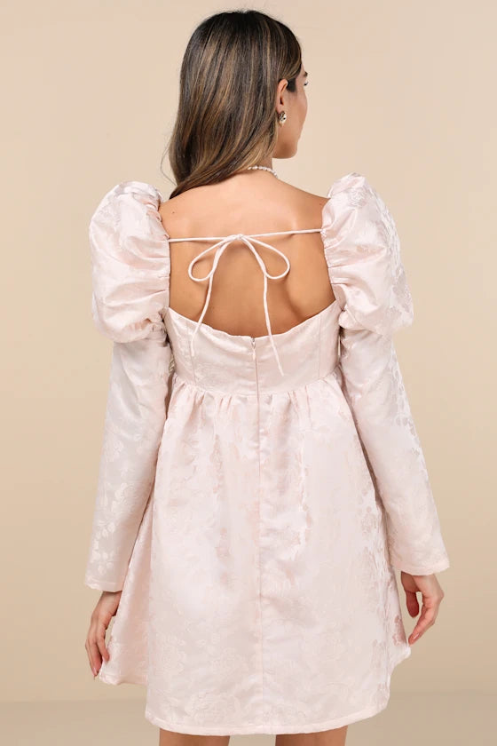 Elevate your homecoming look with the Lavish Sweetie Blush Jacquard Babydoll Mini Dress, featuring elegant puff shoulders and a delicate jacquard texture for a refined silhouette.
