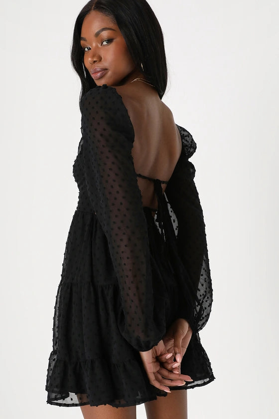 Longing And Love Swiss Dot Puff Long Sleeve Mini Dress Homecoming Dresses - Black / US 2 / UK 6 / EU 32