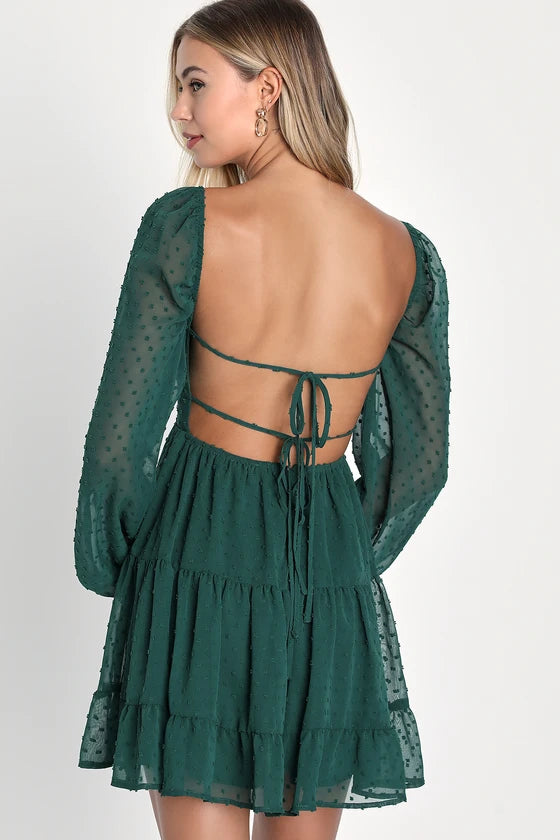 Longing And Love Swiss Dot Puff Long Sleeve Mini Dress Homecoming Dresses - Emerald / US 2 / UK 6 / EU 32