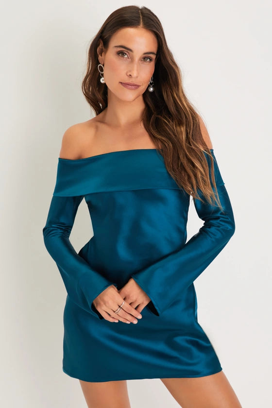 This elegant satin mini dress features an off-the-shoulder design, perfect for homecoming events. Its luxurious fabric and refined silhouette offer a sophisticated and stylish look for special occasions.