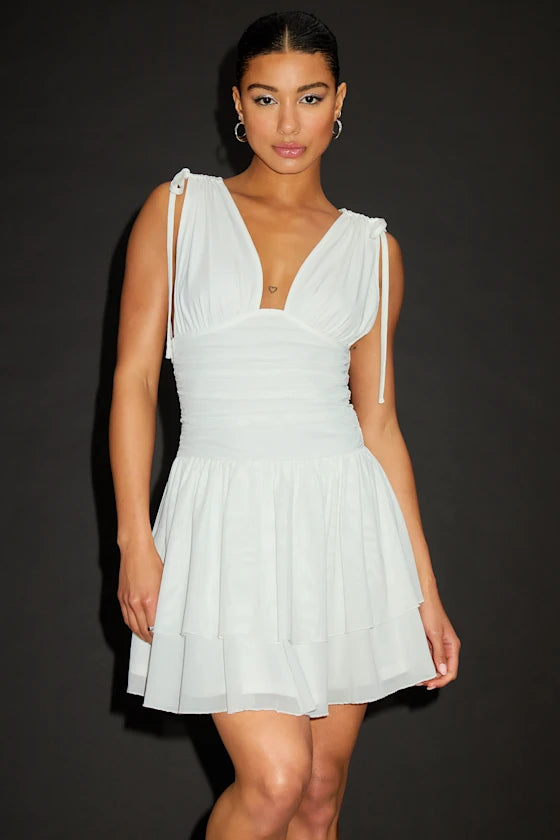This tiered mini dress features delicate mesh fabric with ruched detailing, making it an elegant choice for homecoming events. Its layered design adds dimension and movement, combining style with a flattering fit. Perfect for those seeking a sophisticated yet youthful look.