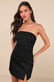 This strapless bodycon mini dress features a modern woven texture, designed for events and homecoming occasions. Its sleek silhouette offers a contemporary and elegant look, perfect for making a stylish statement.