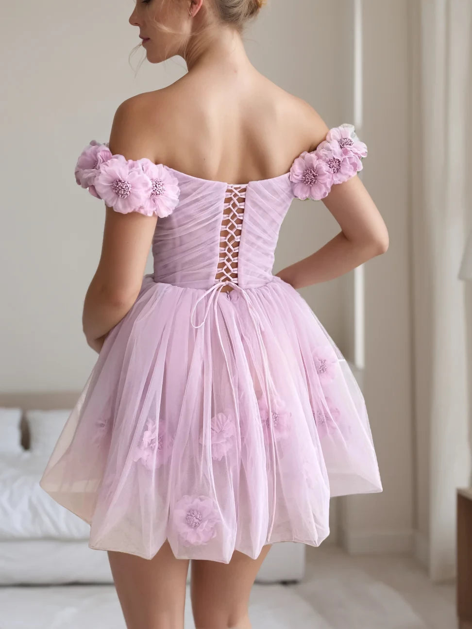 Romantic A - Line Off - Shoulder Short Sleeve Lace - Up Back Mini Length Homecoming Dresses