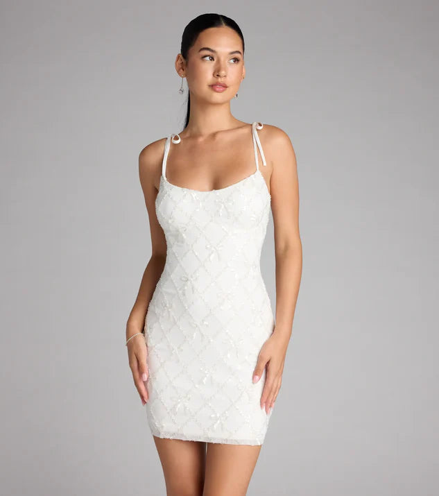 This mini dress features a delicate bow adorned with sequins and pearls, making it an elegant choice for homecoming events. Its refined design combines sparkle and sophistication for a standout look.