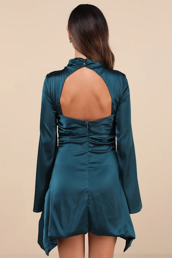 Sultry Elevation Satin Long Sleeve Cutout Mini Dress Homecoming Dresses - Dark Teal / US 2 / UK 6 / EU 32