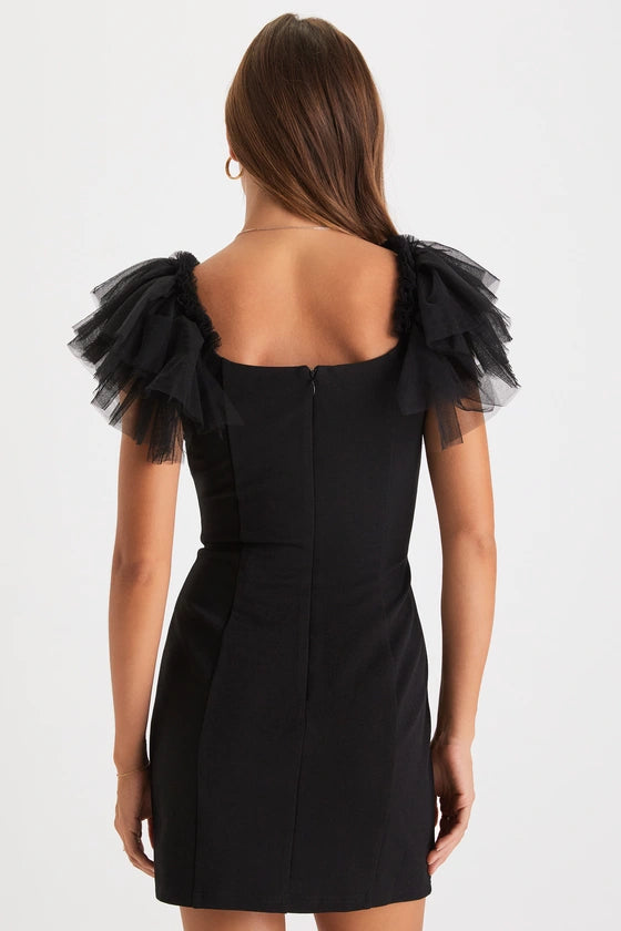 This bodycon mini dress features delicate tulle flutter sleeves, perfectly designed for homecoming events. Its fitted silhouette enhances your figure while the airy sleeves add a touch of elegance and movement. Ideal for making a sophisticated statement at any special occasion.