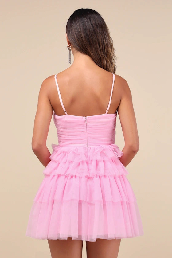 Tulle Pleated Sleeveless Tiered Mini Dress Homecoming Dress - Pink / US 2 / UK 6 / EU 32