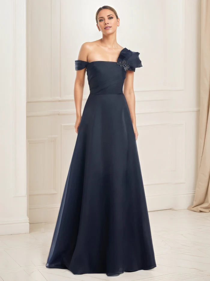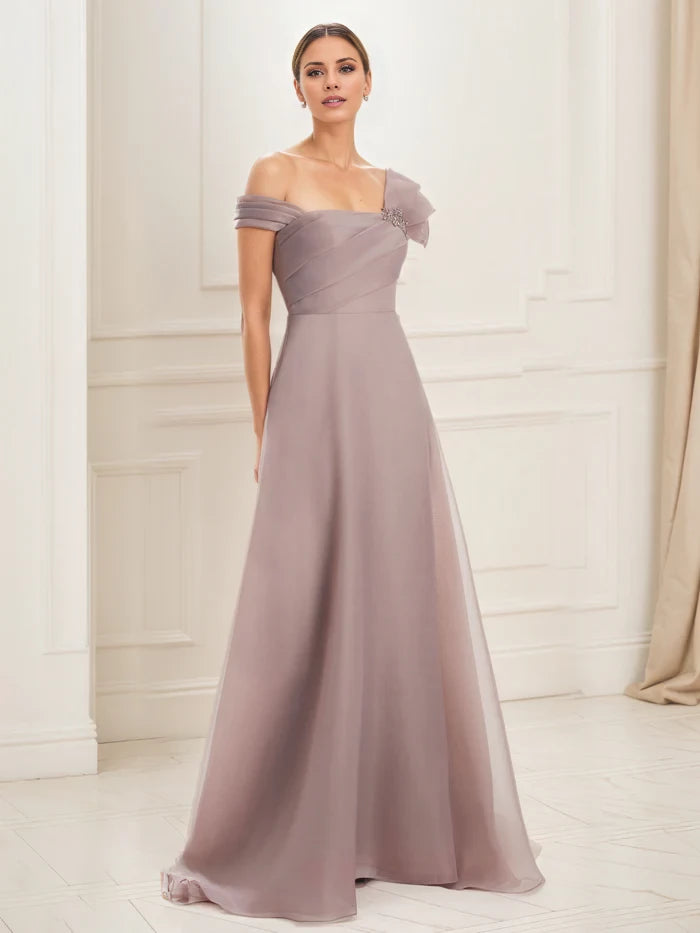 Elegant A-line mother of the bride dress featuring a pleated bodice and a single shoulder adorned with delicate embellishments for a refined, sophisticated look.