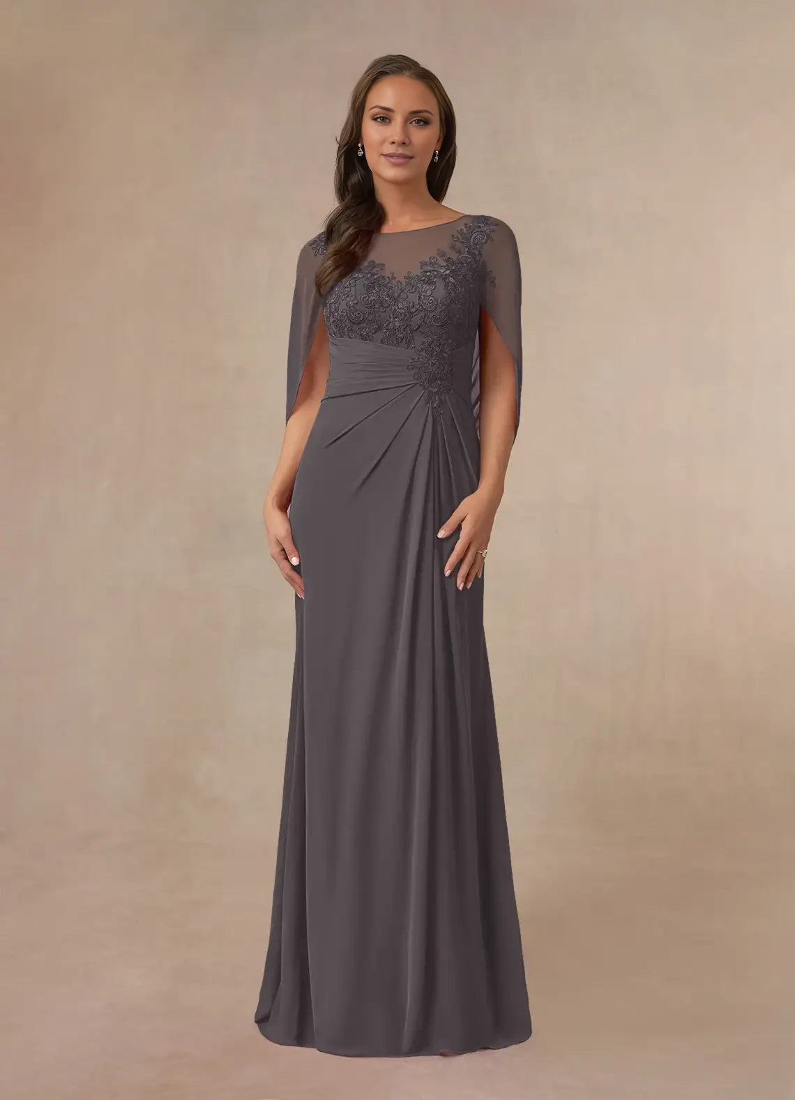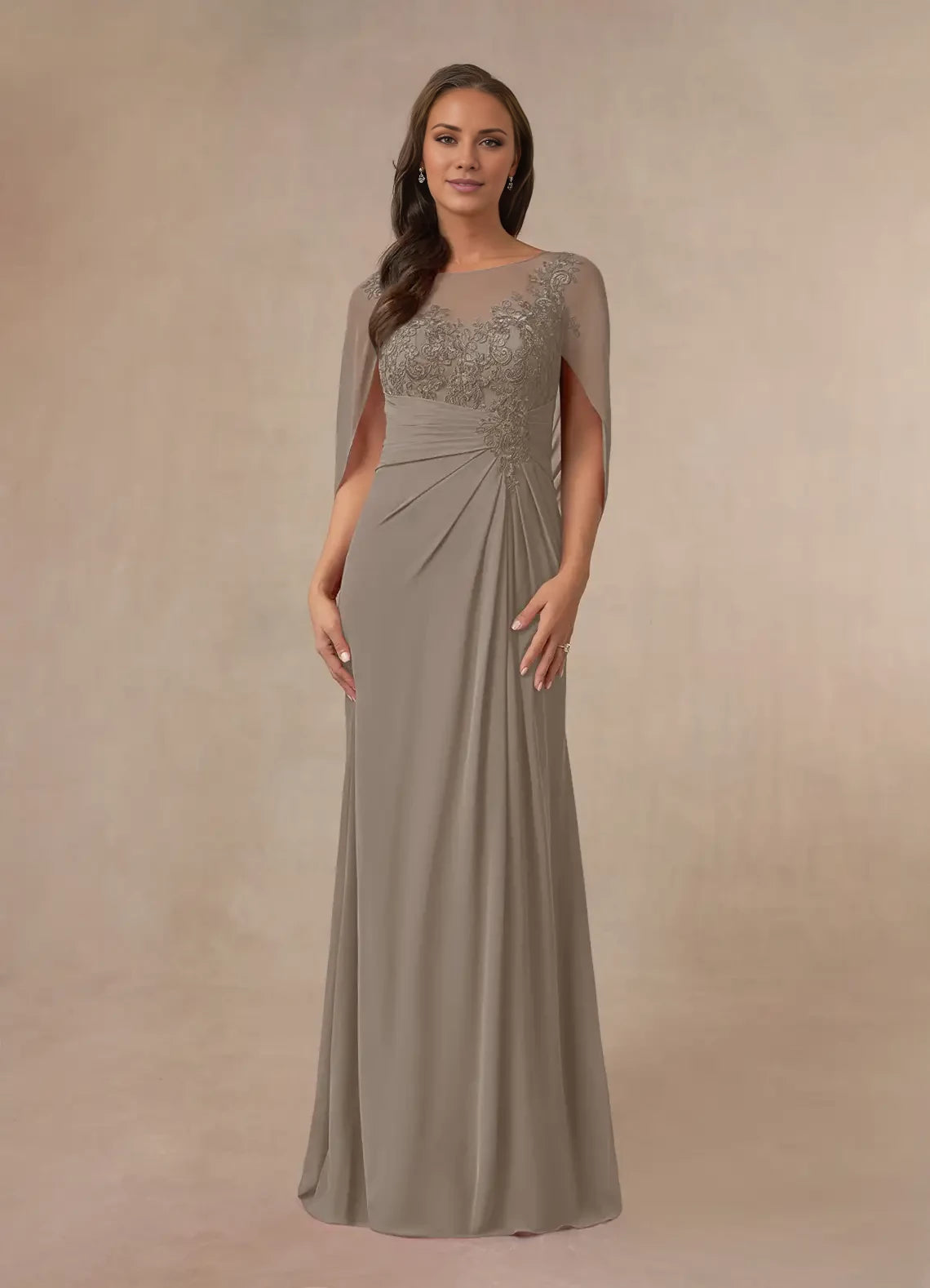 This A-line chiffon dress features a delicate lace capelet, designed specifically for mothers of the bride seeking elegance and refined style.