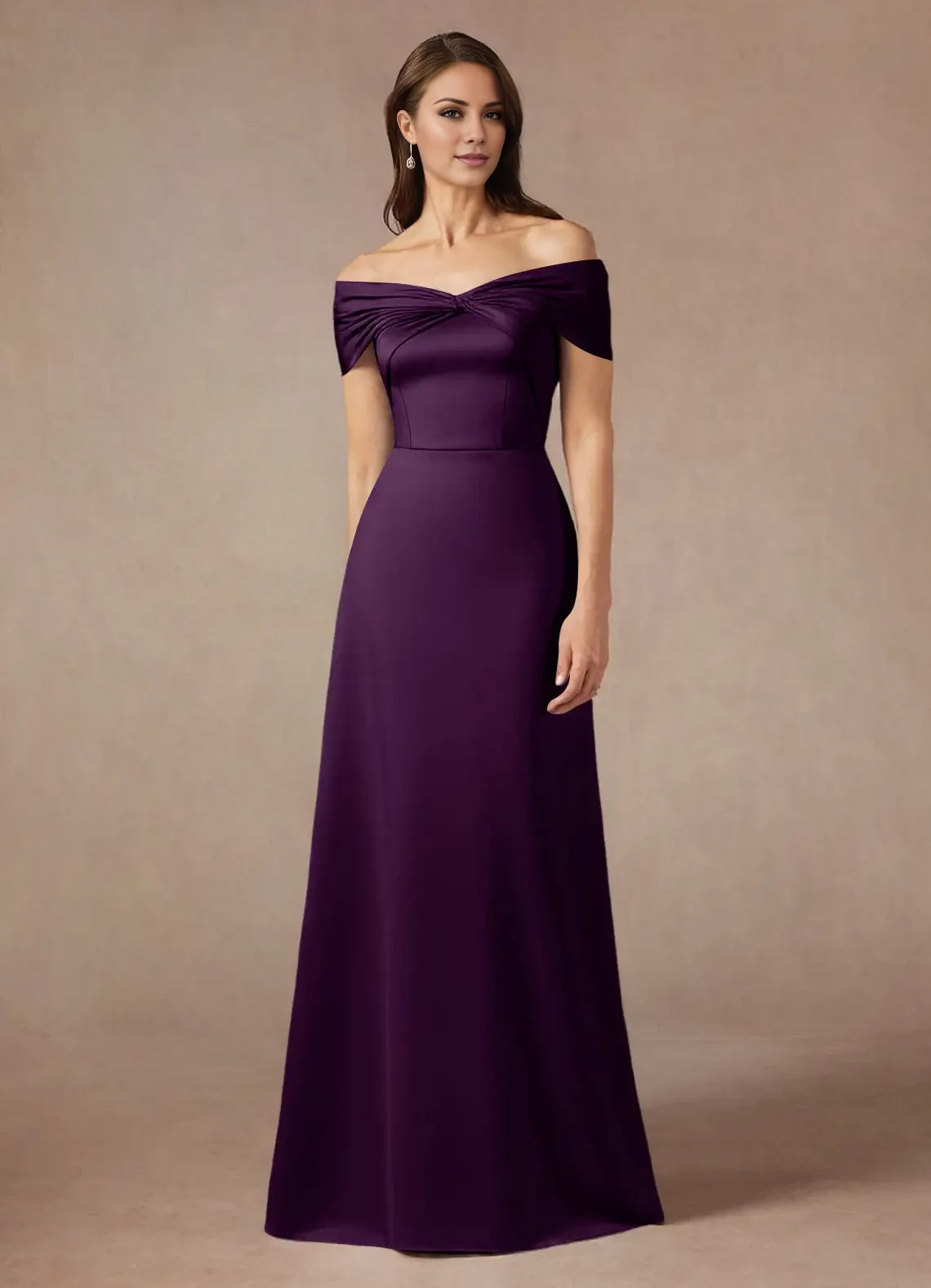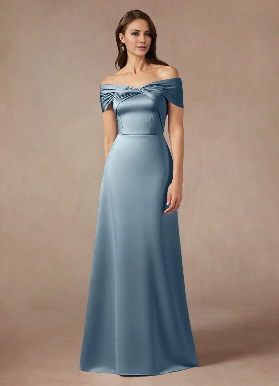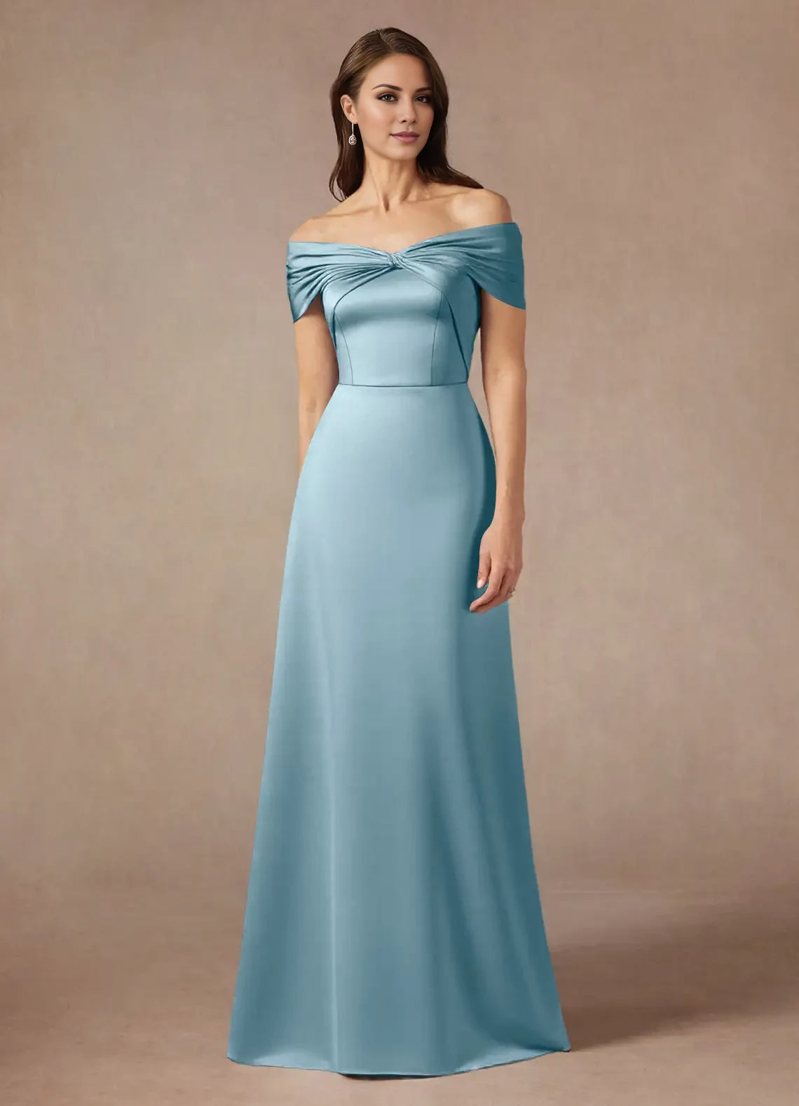 This satin A-line dress features an elegant off-the-shoulder design, ideal for mothers of the bride seeking a sophisticated and flattering silhouette.