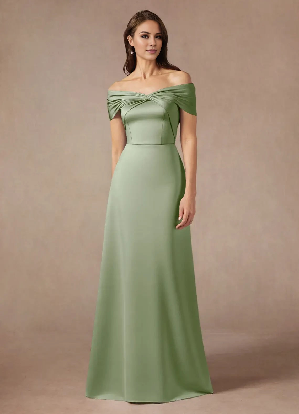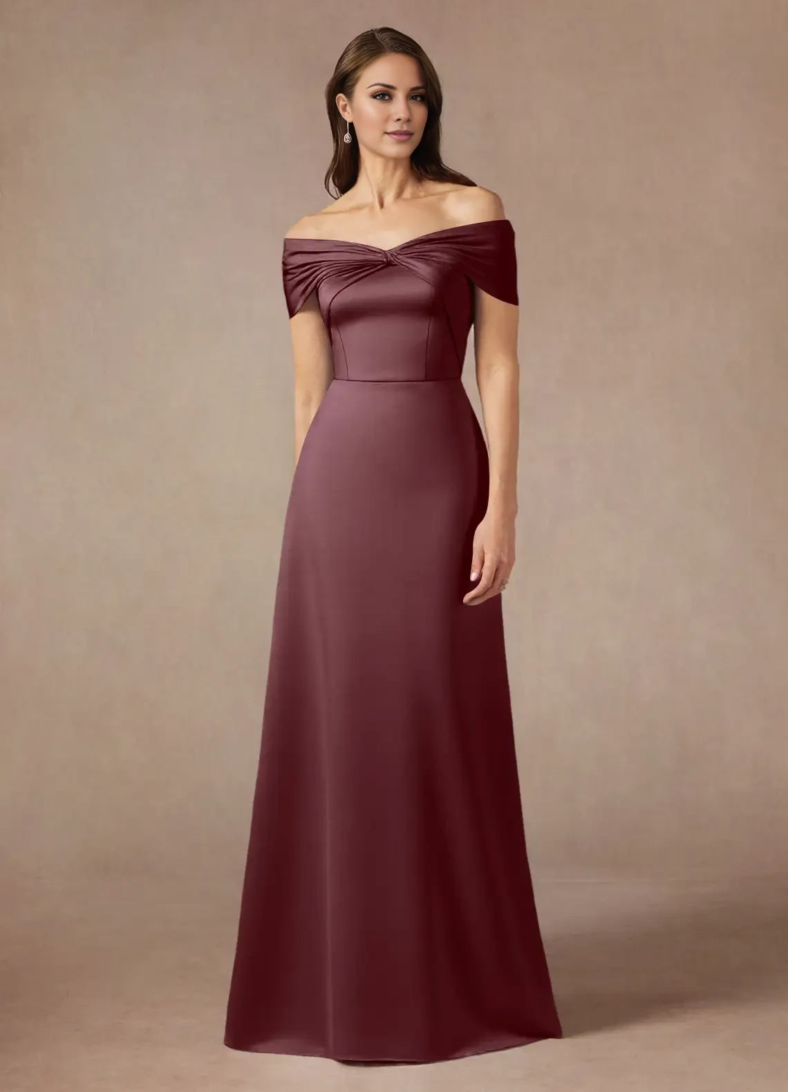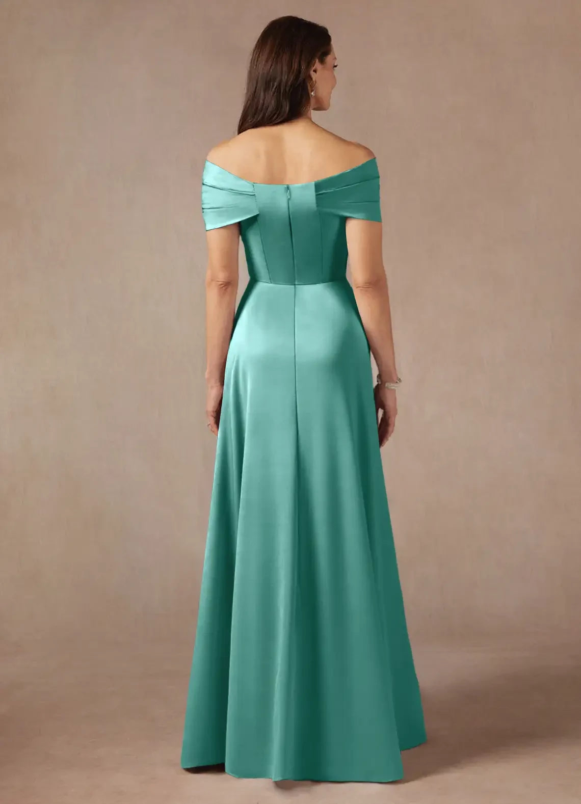 This satin A-line dress features an elegant off-the-shoulder design, ideal for mothers of the bride seeking a sophisticated and flattering silhouette.