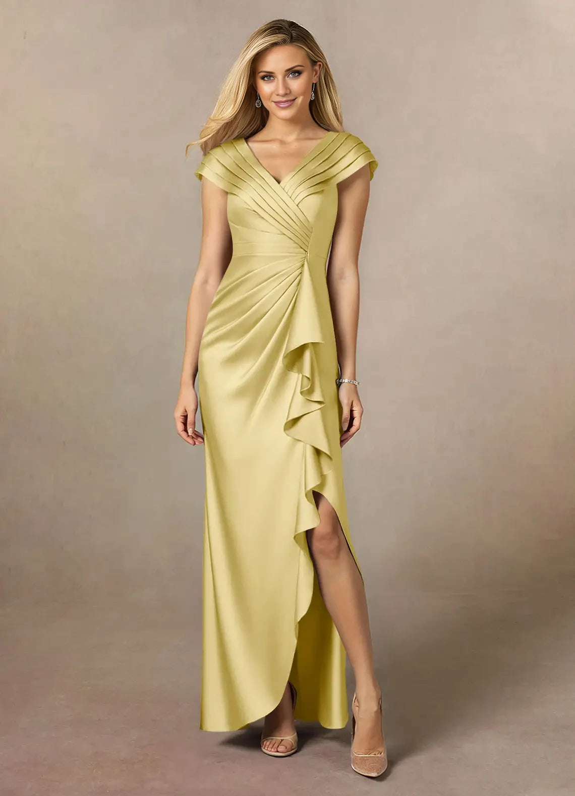 This elegant A-line satin dress features delicate pleating, making it an ideal choice for mothers of the bride seeking a refined and timeless look.