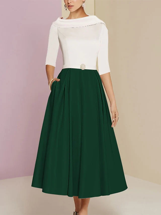 This A-line princess dress features a jewel neckline, half sleeves, and a tea-length skirt adorned with pleats, designed specifically for the mother of the bride.