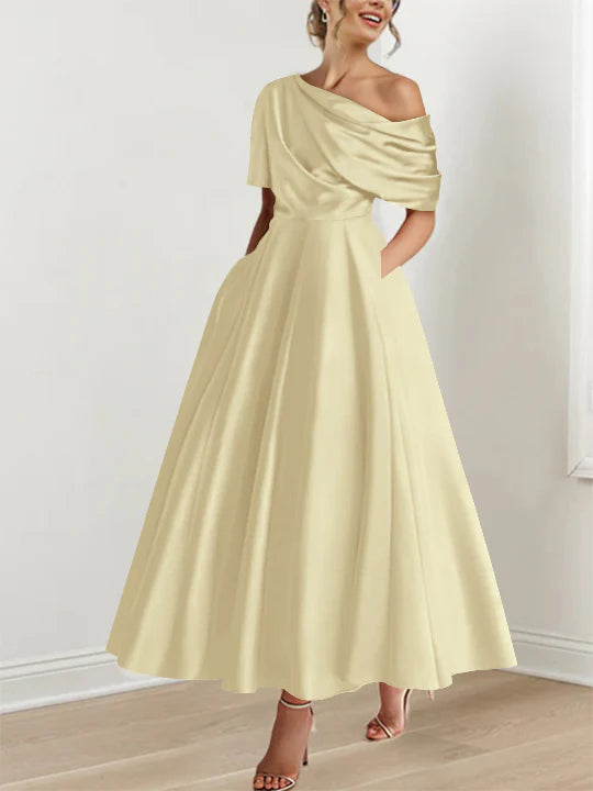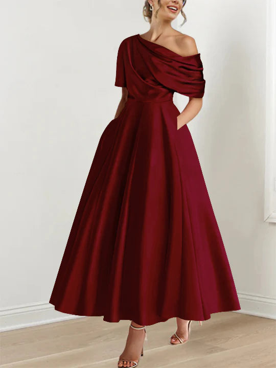 This A-line princess-style mother of the bride dress features a one-shoulder design, half sleeves, and an ankle-length hem. Delicate ruffles add an elegant touch to the silhouette, making it a sophisticated choice for special occasions.