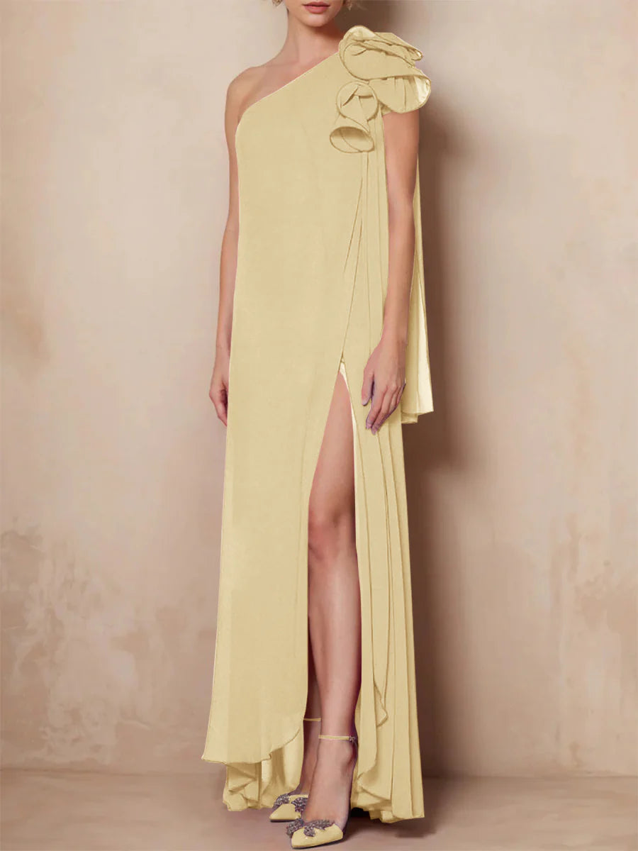 This floor-length mother of the bride dress features a sleeveless, one-shoulder design in an A-line or princess silhouette and includes a stylish side split for added elegance.