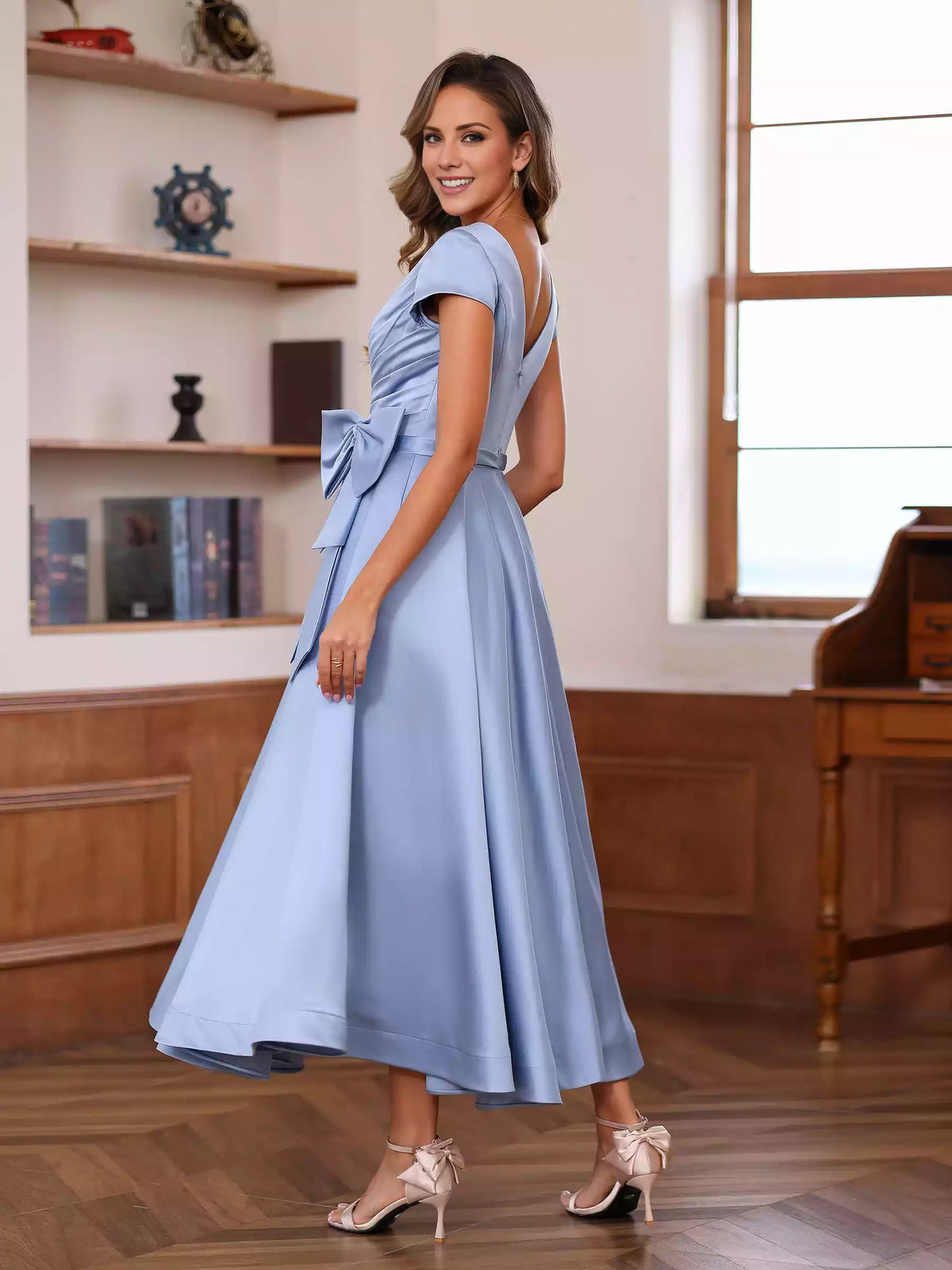 This ankle-length mother of the bride dress features an A-line silhouette with a princess cut, V-neckline, short sleeves, and delicate ruffle details, combining elegance and comfort for a refined look.
