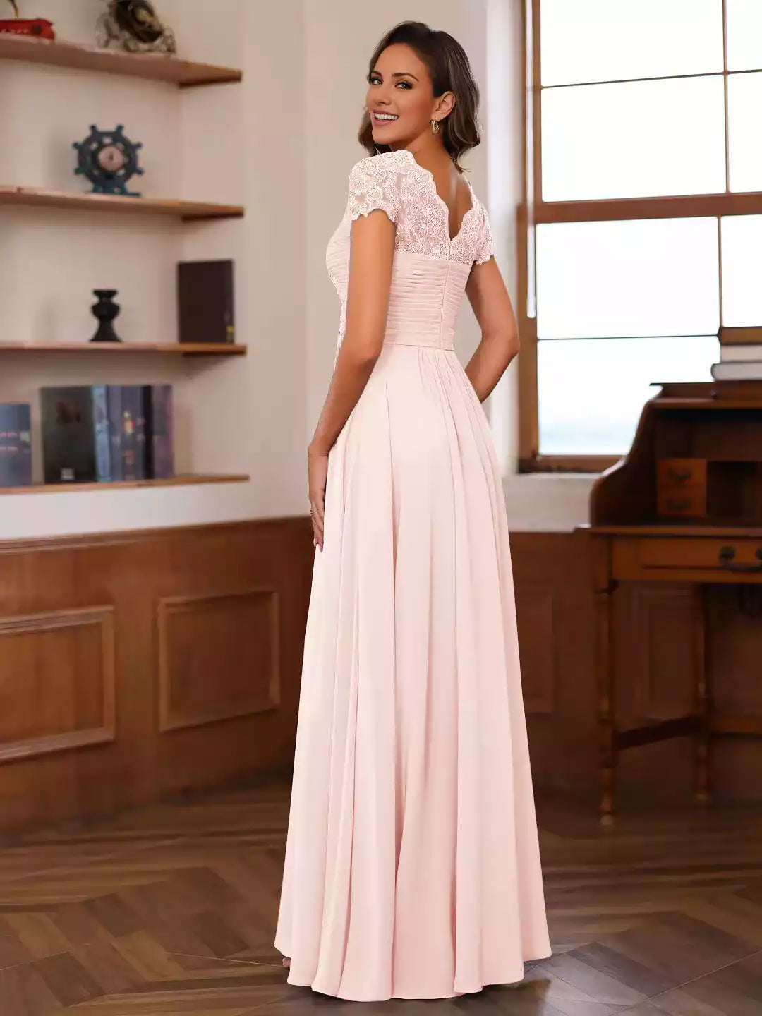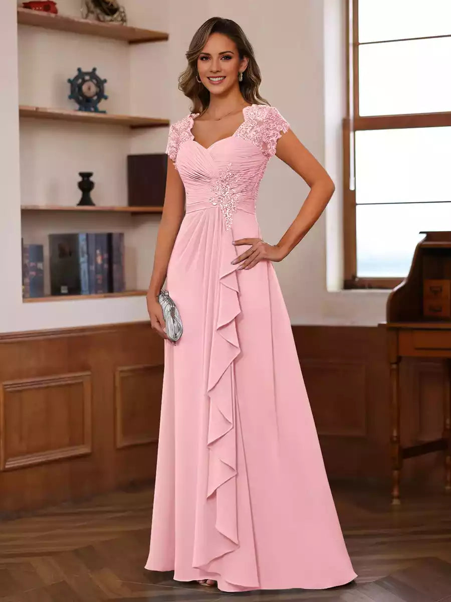 This A-line princess dress features a V-neck and short sleeves, adorned with ruffle appliques. Designed as a mother of the bride gown, it combines elegance with refined detailing for a sophisticated look.