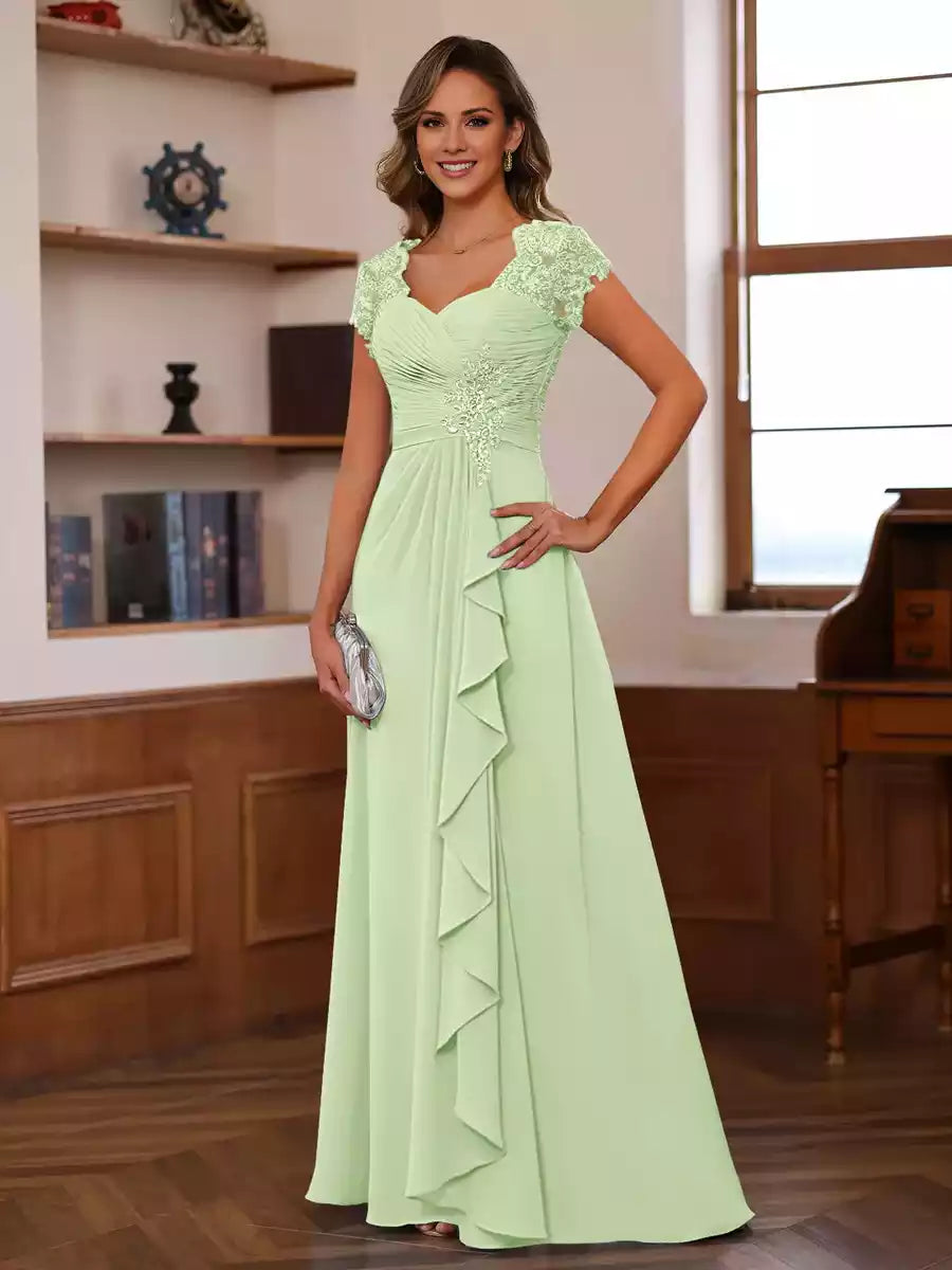 A-Line Princess V-Neck Short Sleeves Groom Dresses with Ruffles Appliques Mother of the Bride Dress
