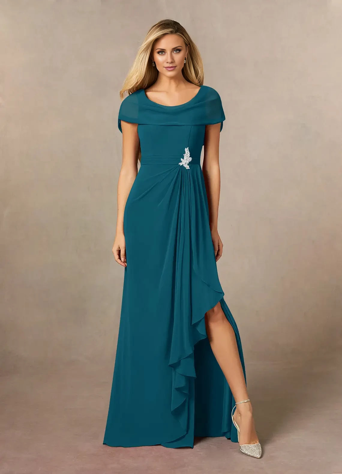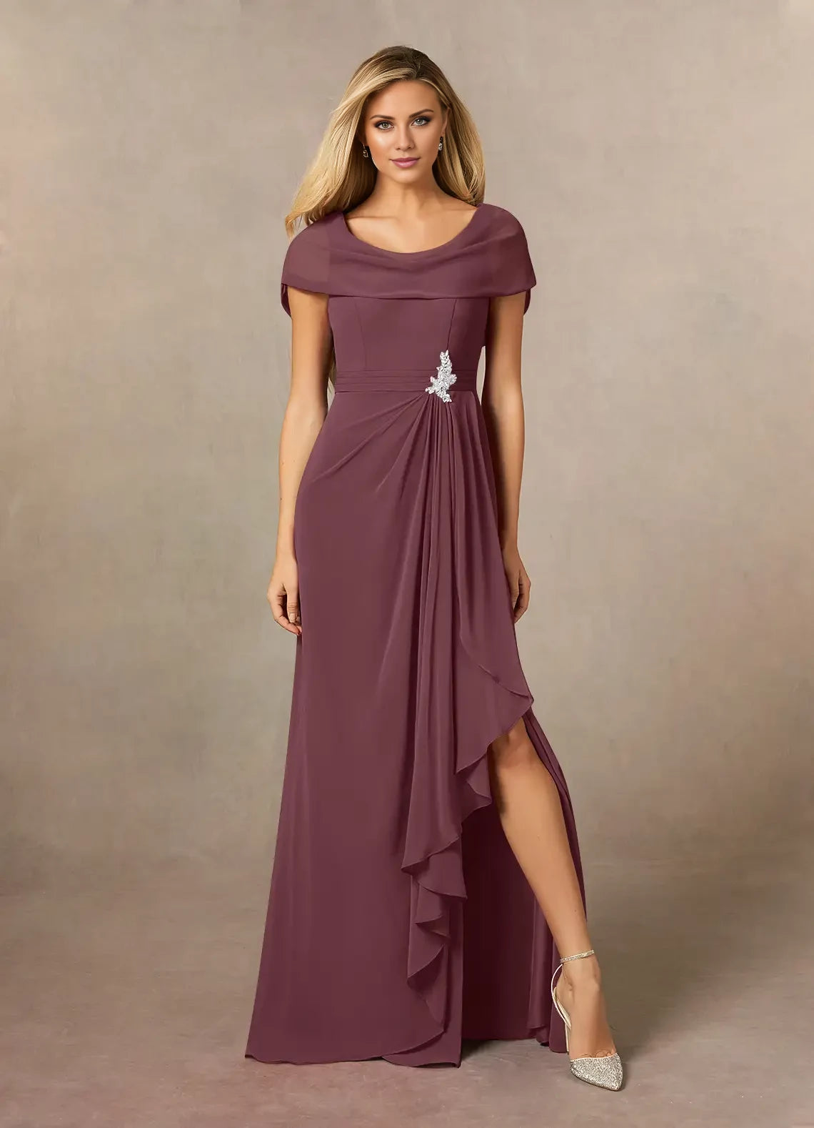 This chiffon dress features an A-line silhouette with a side slit, designed specifically for mothers of the bride seeking elegant and graceful attire.