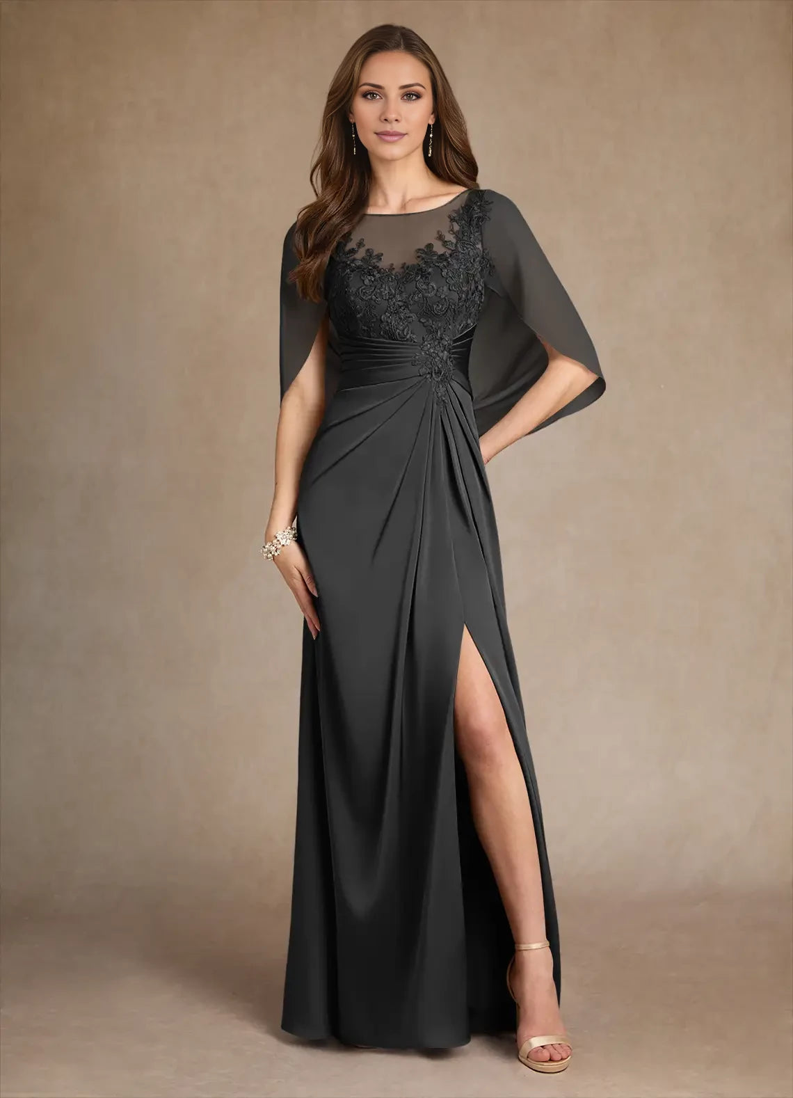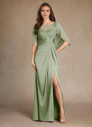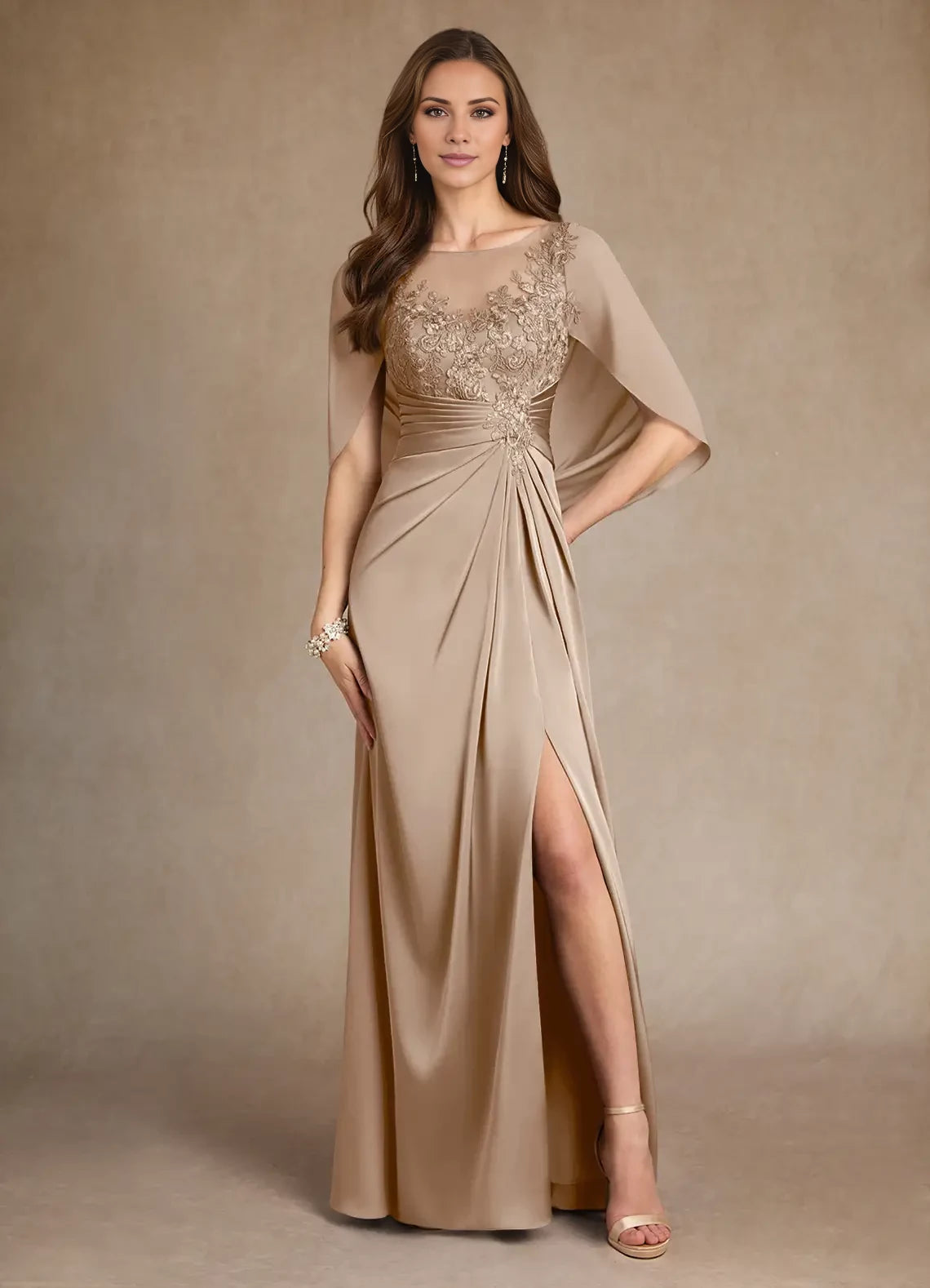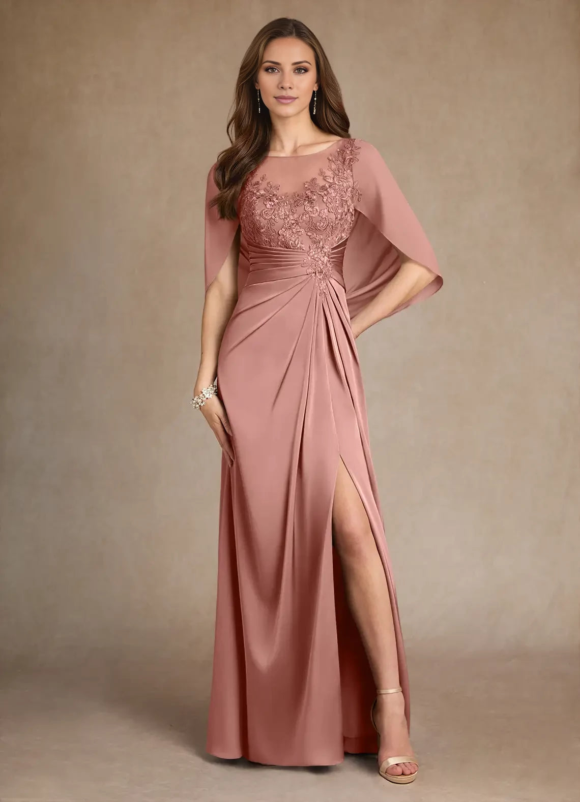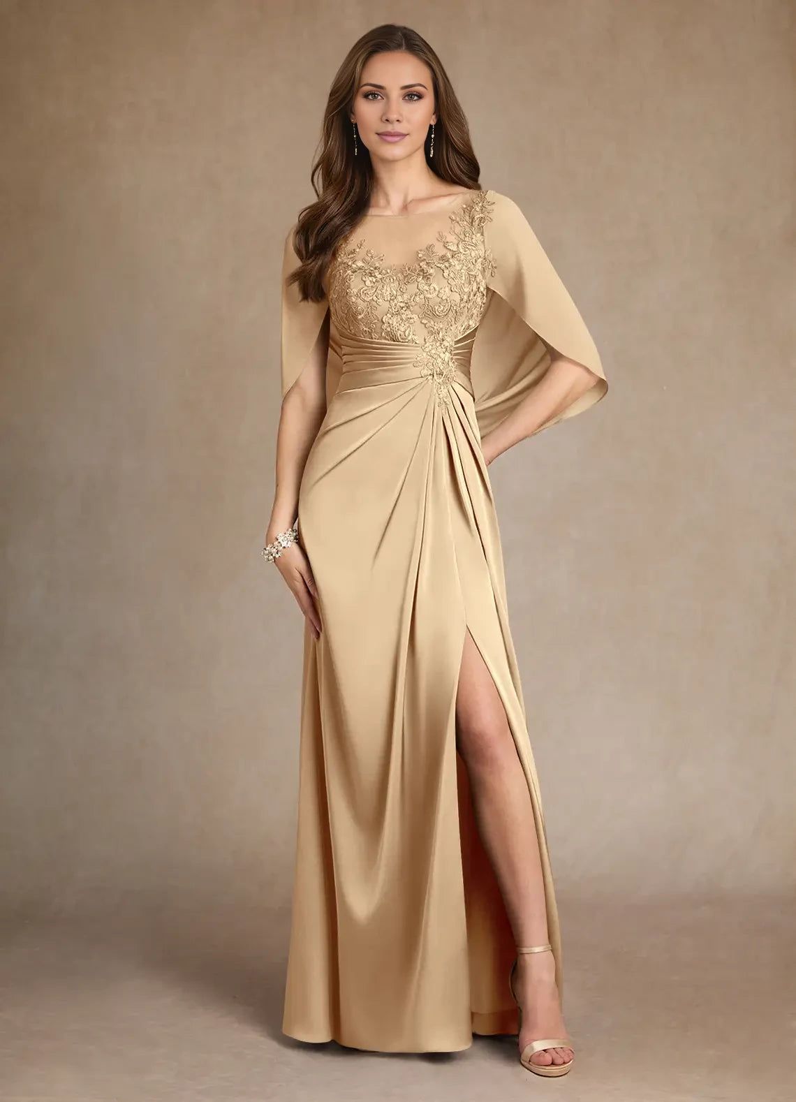 Elegant A-line satin dress featuring a lace design and split fork detail, perfect for mothers of the bride.