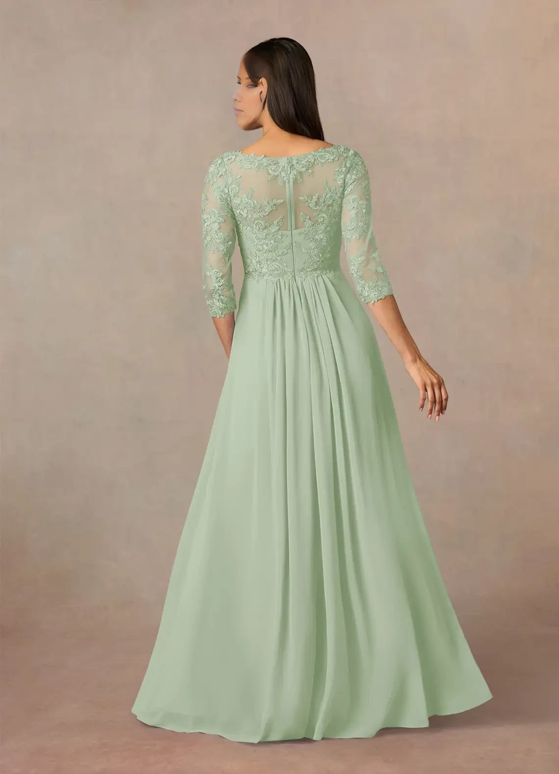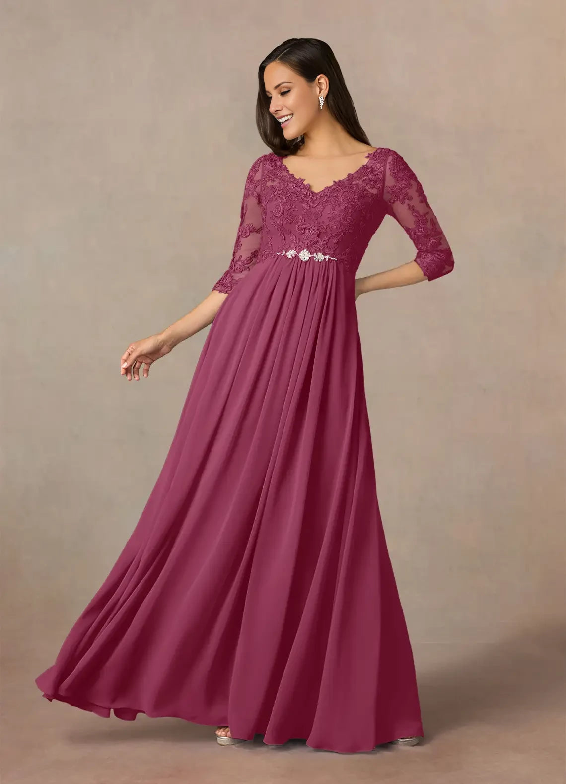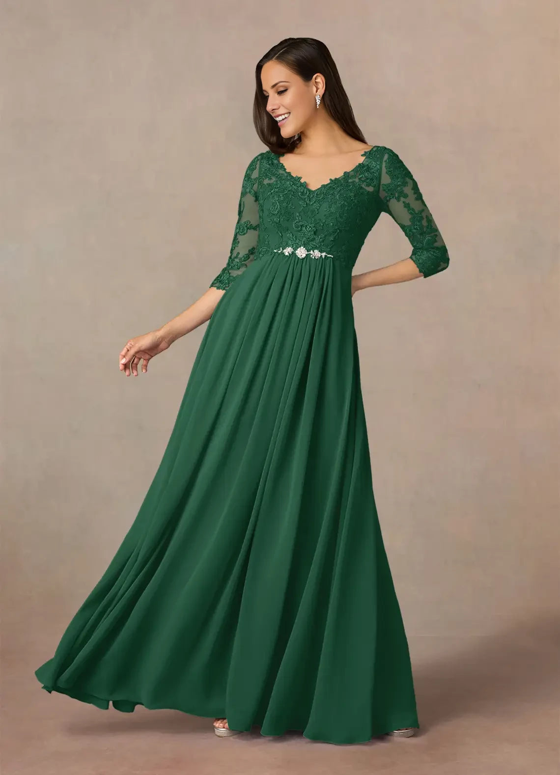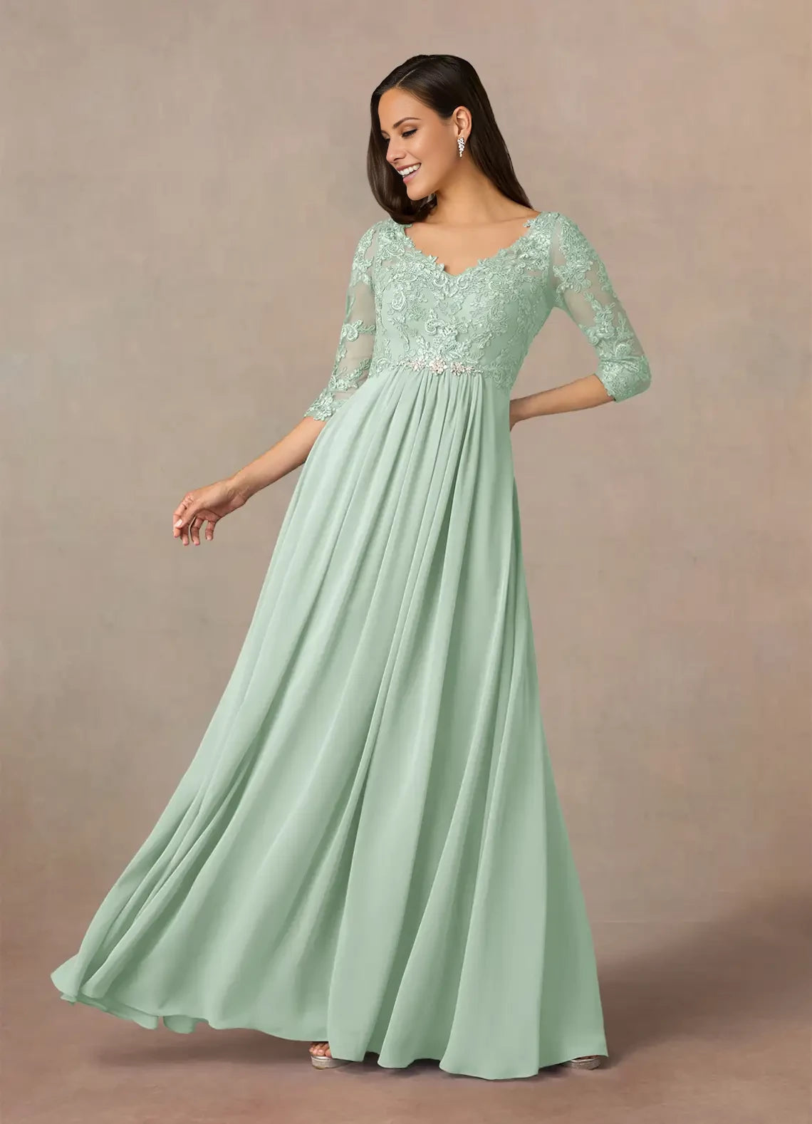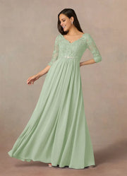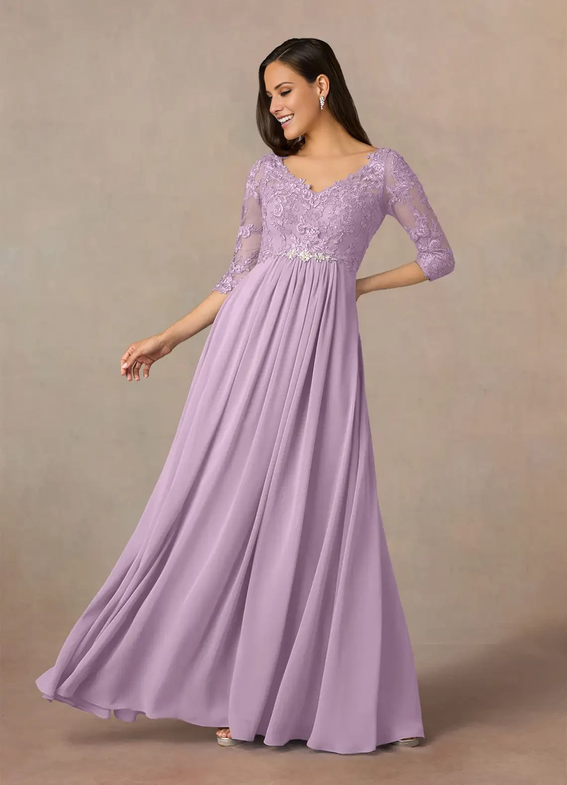 Elegant A-line chiffon dress featuring a delicate lace V-neck design, perfect for mothers of the bride.
