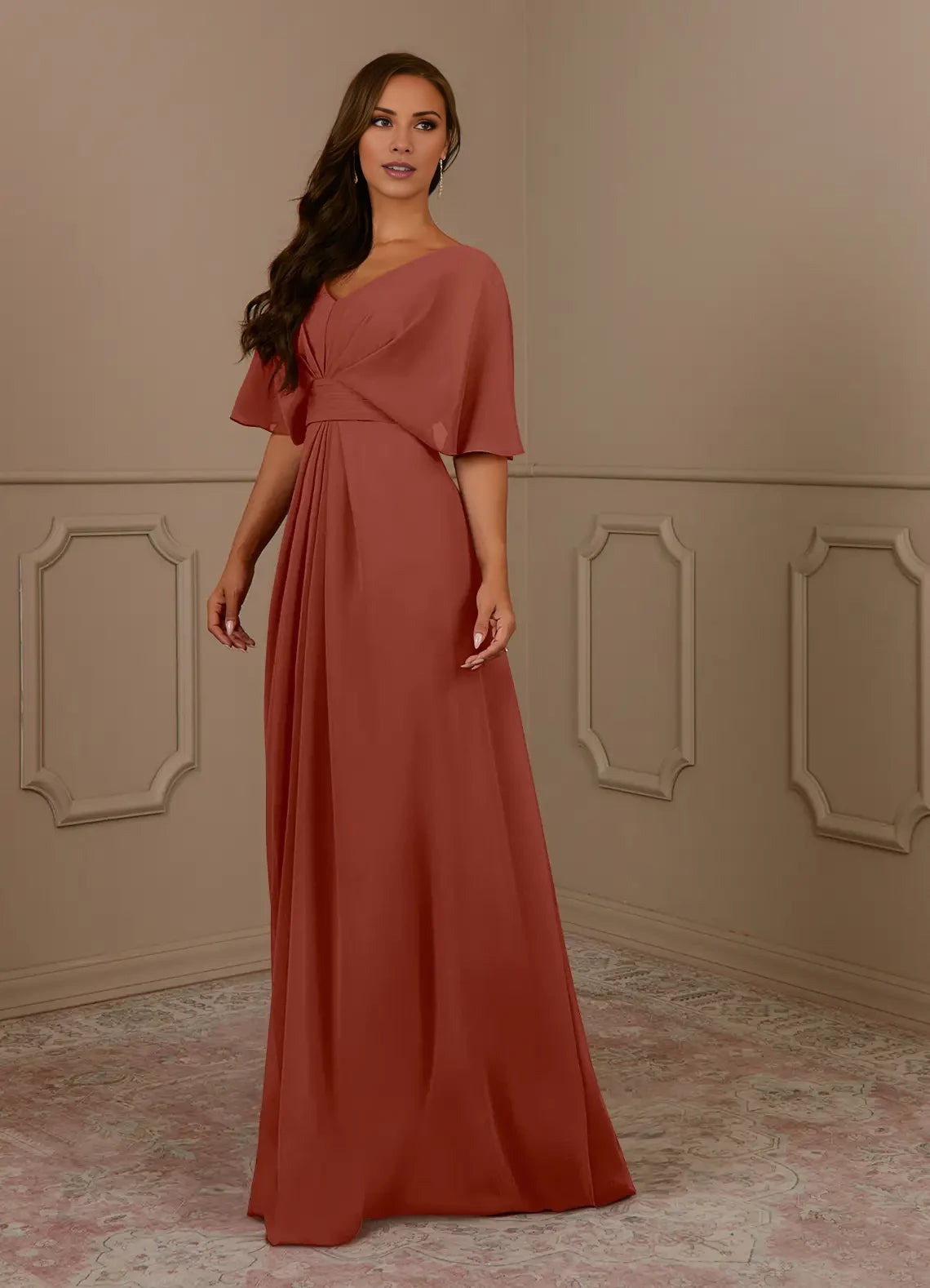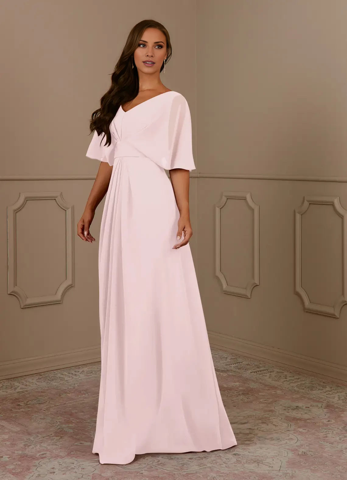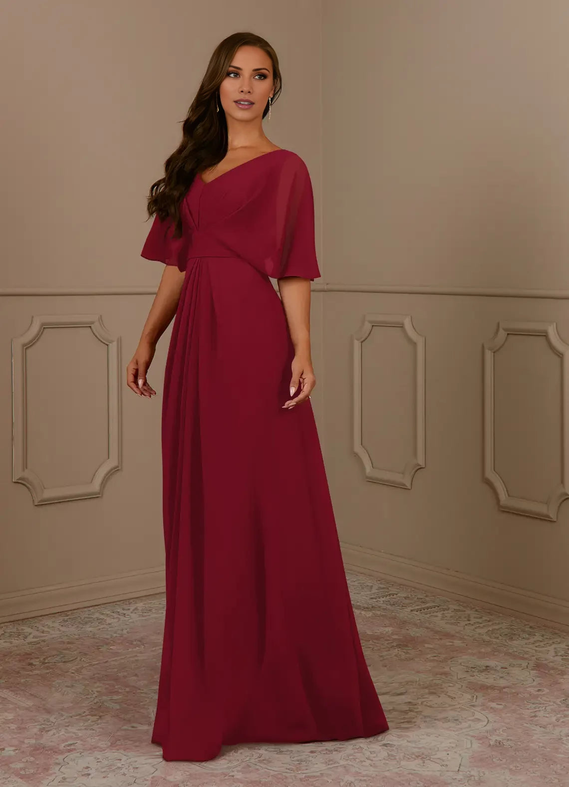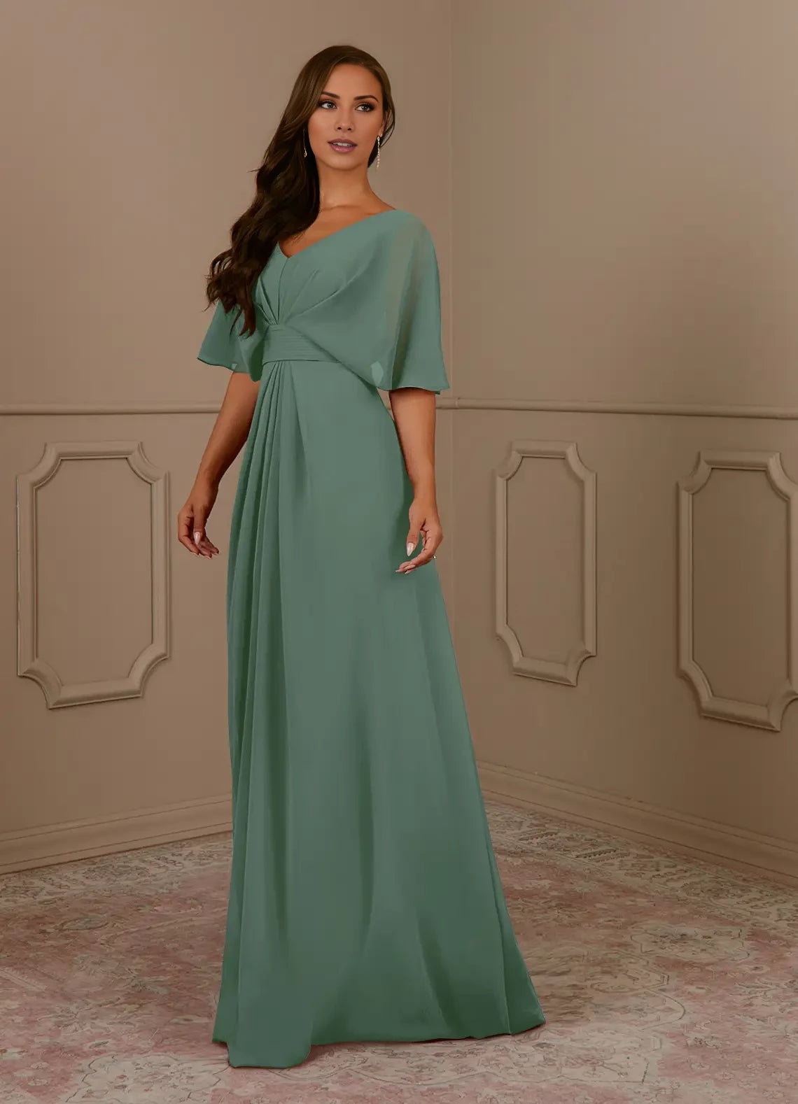 Elegant A-line chiffon dress featuring a V-neckline and delicate pleats, ideal for mothers of the bride seeking timeless sophistication.