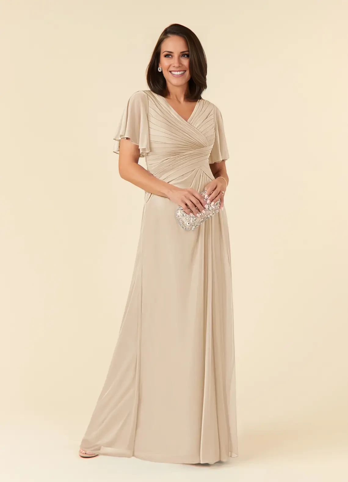 Elegant A-Line V-Neck Dress with Pleated Mesh Detailing, Perfect for the Mother of the Bride