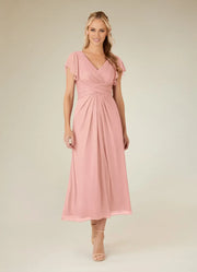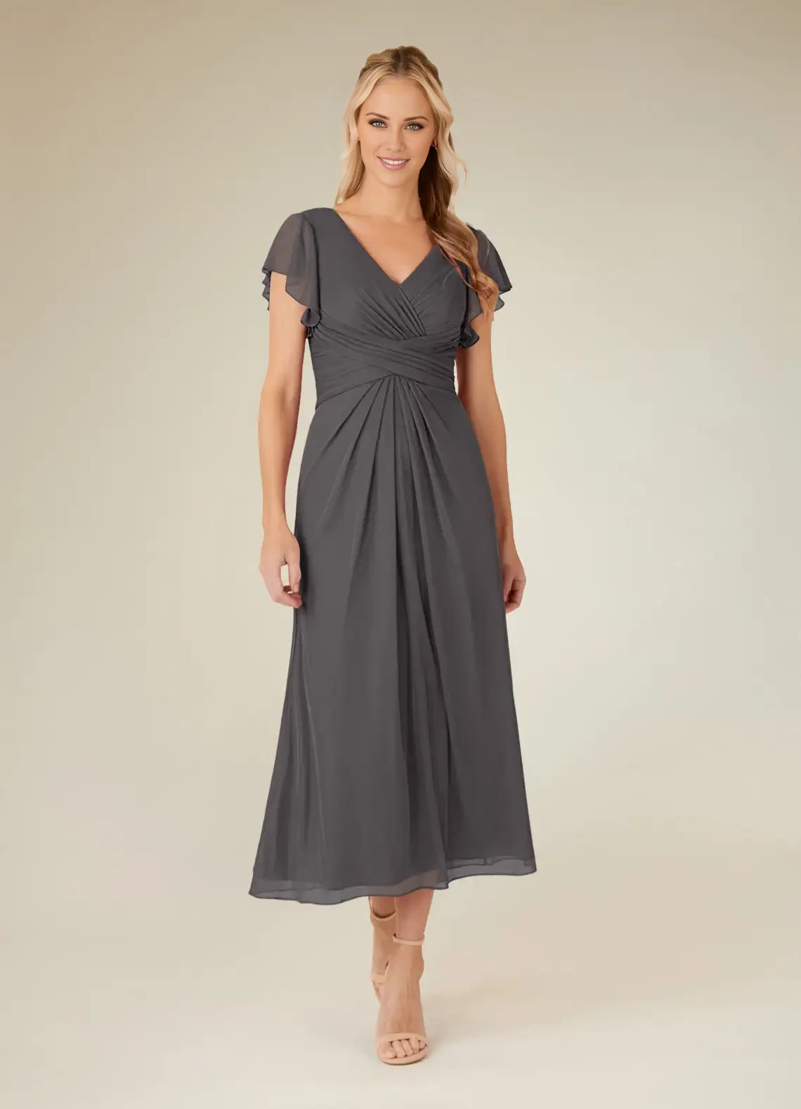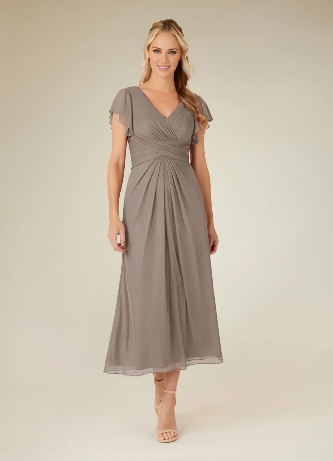 This pleated mesh dress features an A-line silhouette with a V-neck design, ideal for mothers of the bride seeking elegance and comfort.