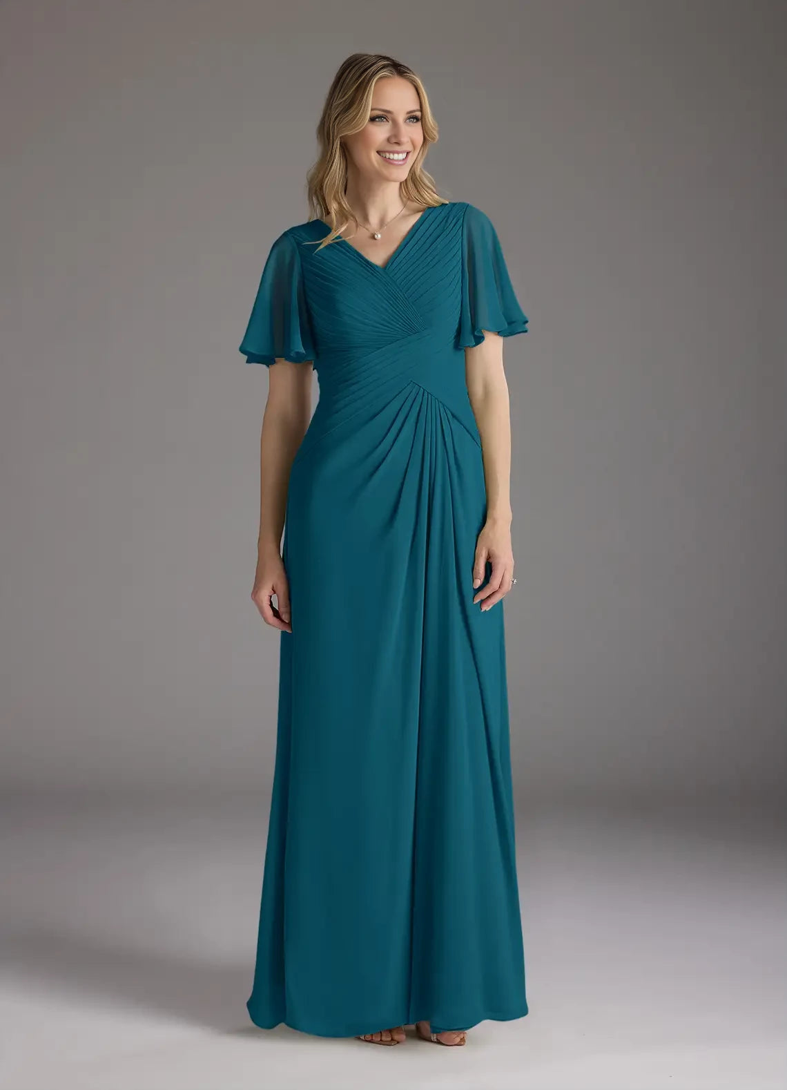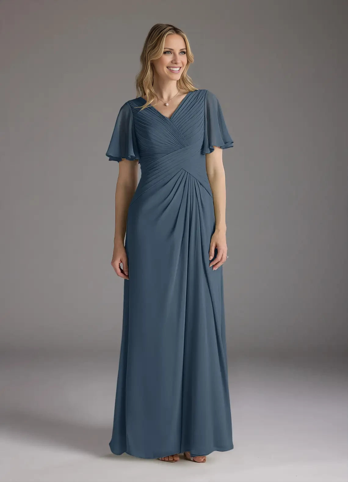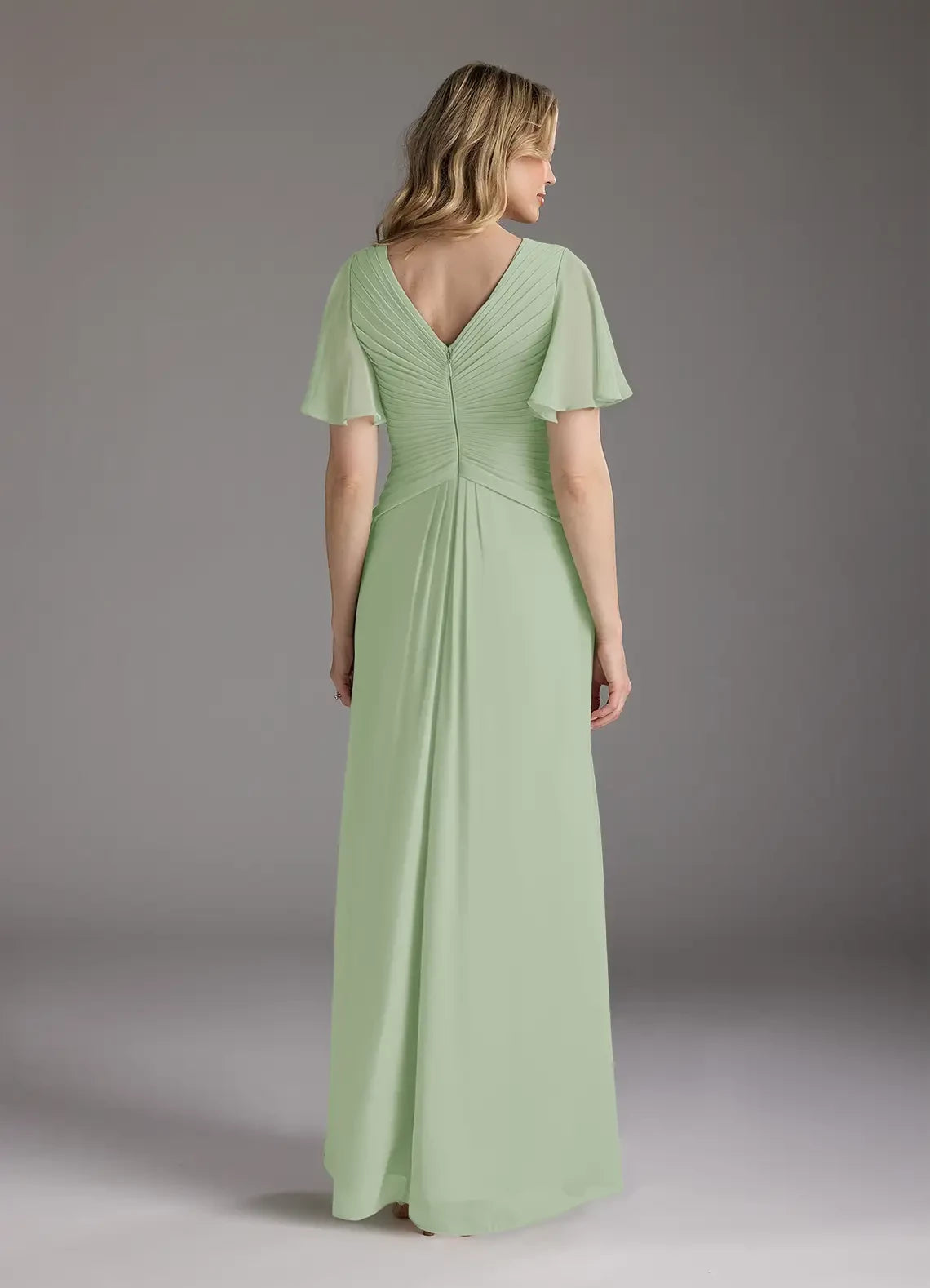 This chiffon dress features an A-line silhouette with a V-neck and ruched detailing, designed specifically as an elegant option for mothers of the bride.