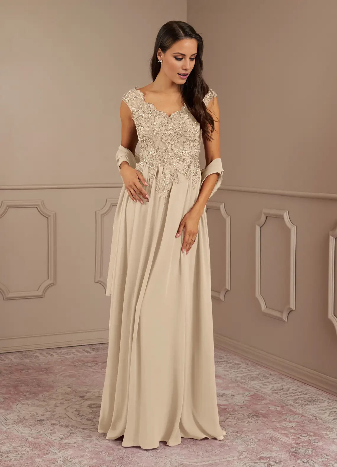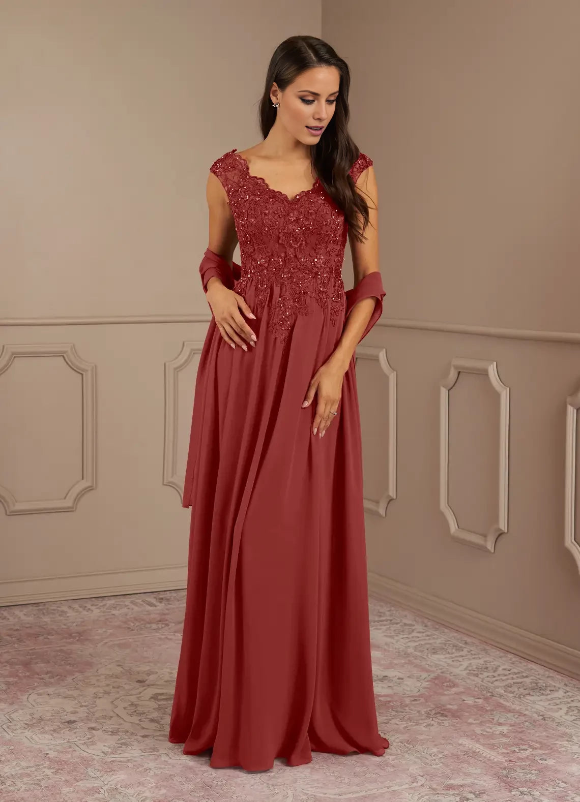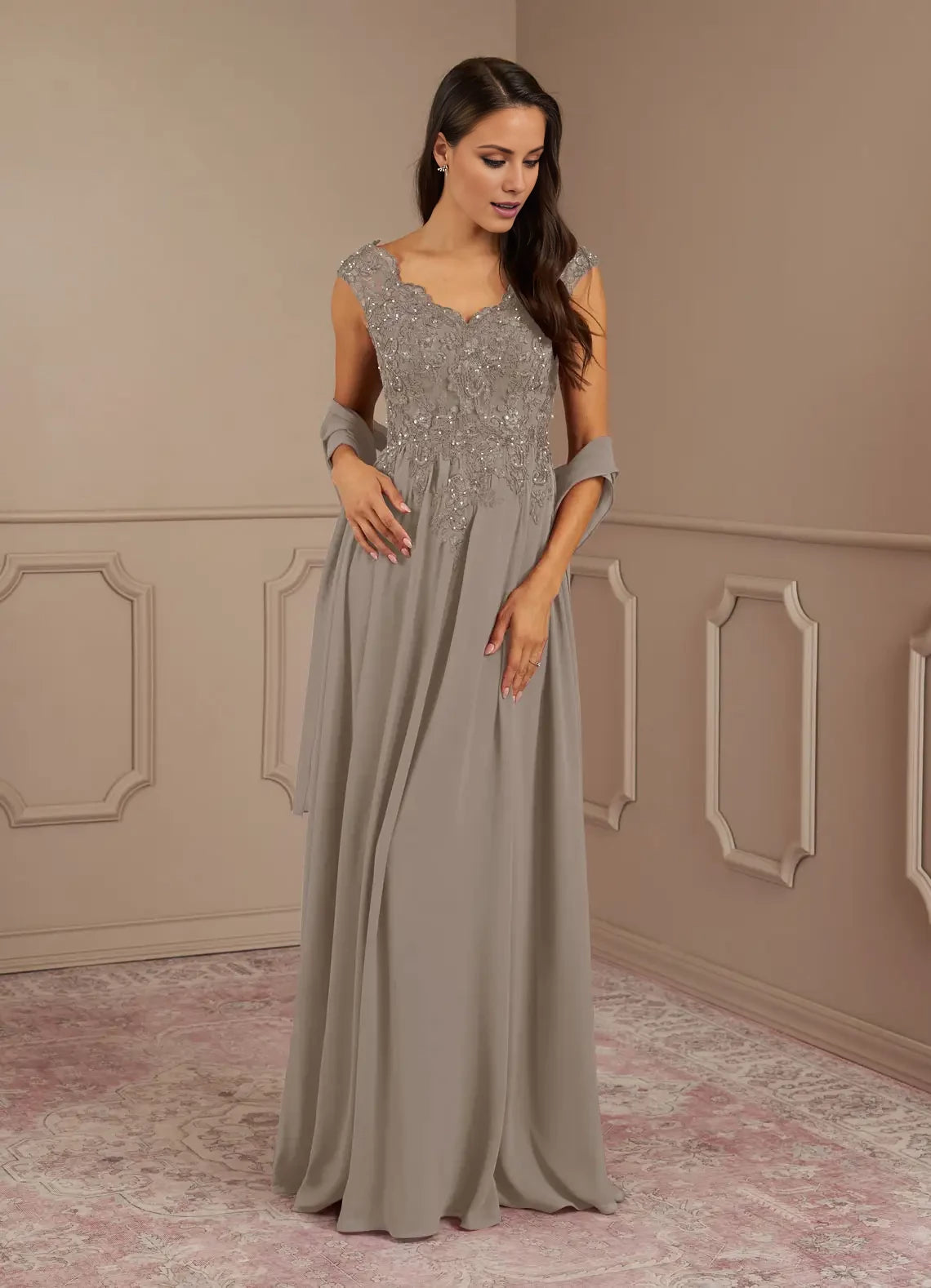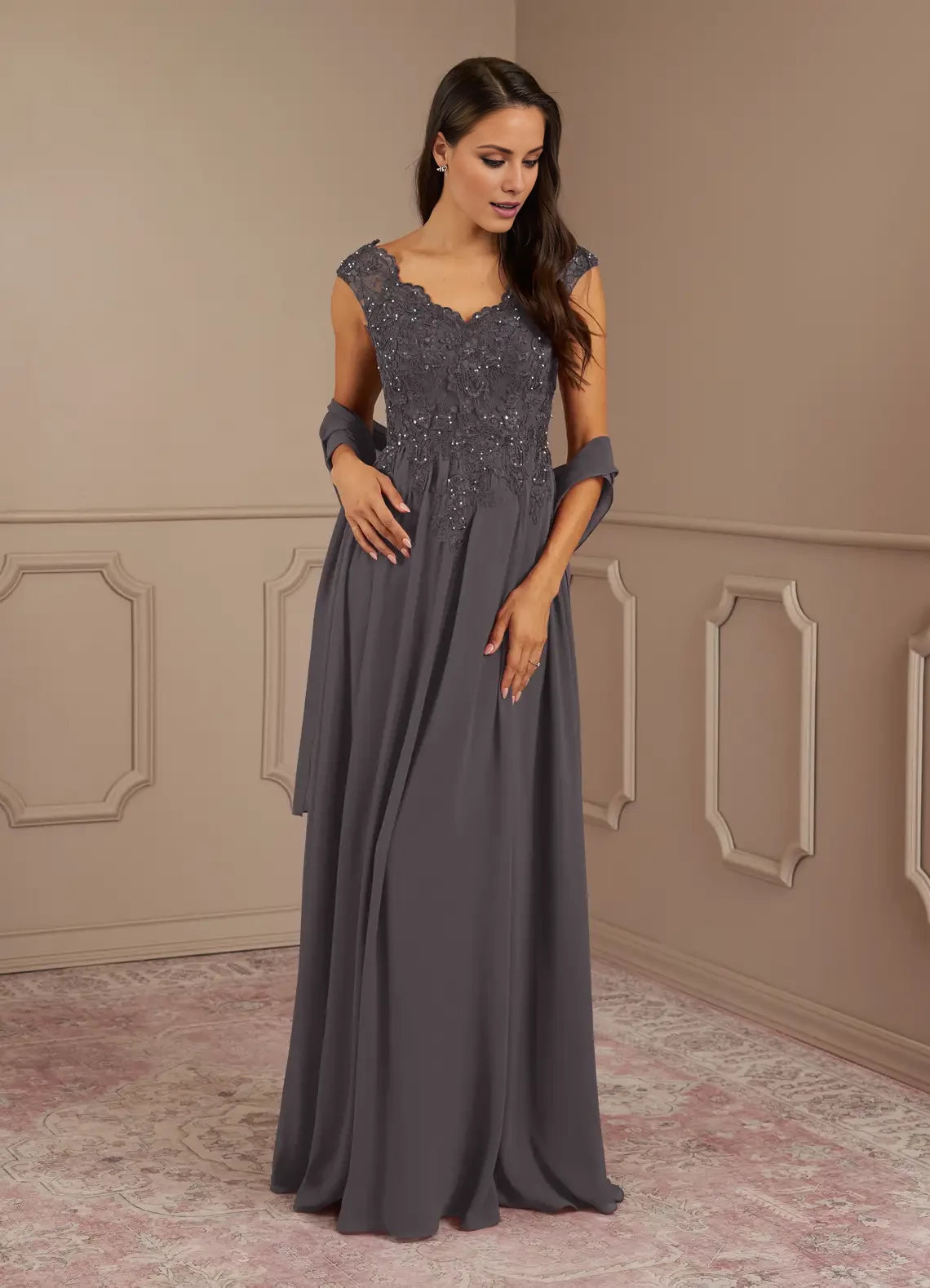 This mother of the bride dress features an elegant A-line silhouette, a flattering V-neck, and sparkling sequins delicately layered over chiffon for a refined and graceful look.